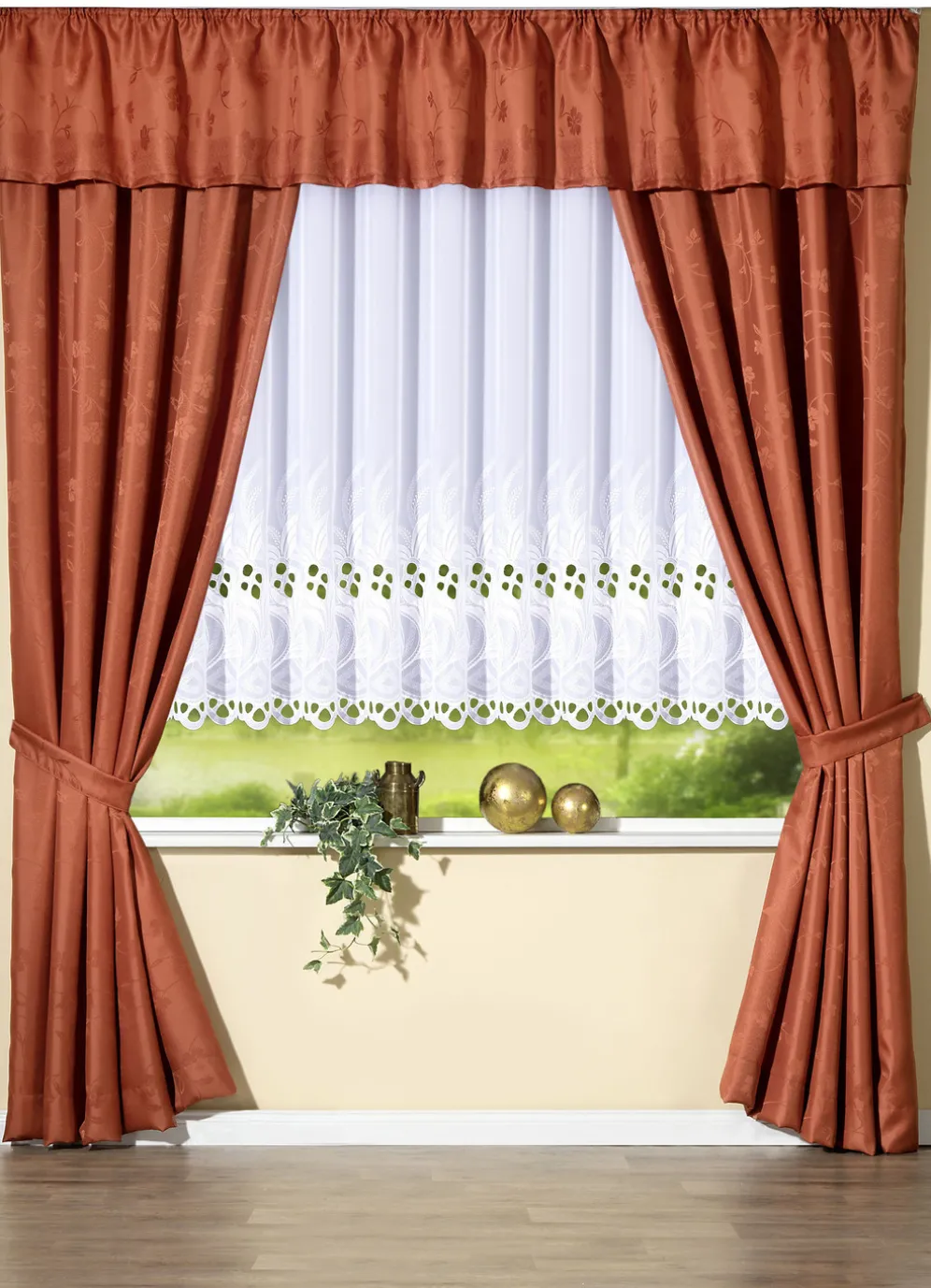 Stickerei-Store in gerader Form, mit hochwertiger Plauener Stickerei und Universalschienenband. Die Qualität: Voile aus 100% Polyester.
