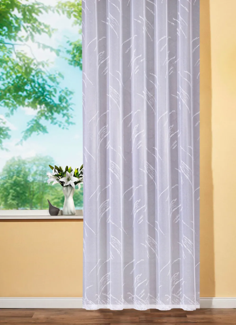 Fantastischer Store mit toller Musterung, Bleibandabschluss sowie Automatikfaltenband. Bitte bestellen Sie die 2,5-fache Leisten- bzw. Dekobreite. Qualität: Jacquard, 100% Polyester.
