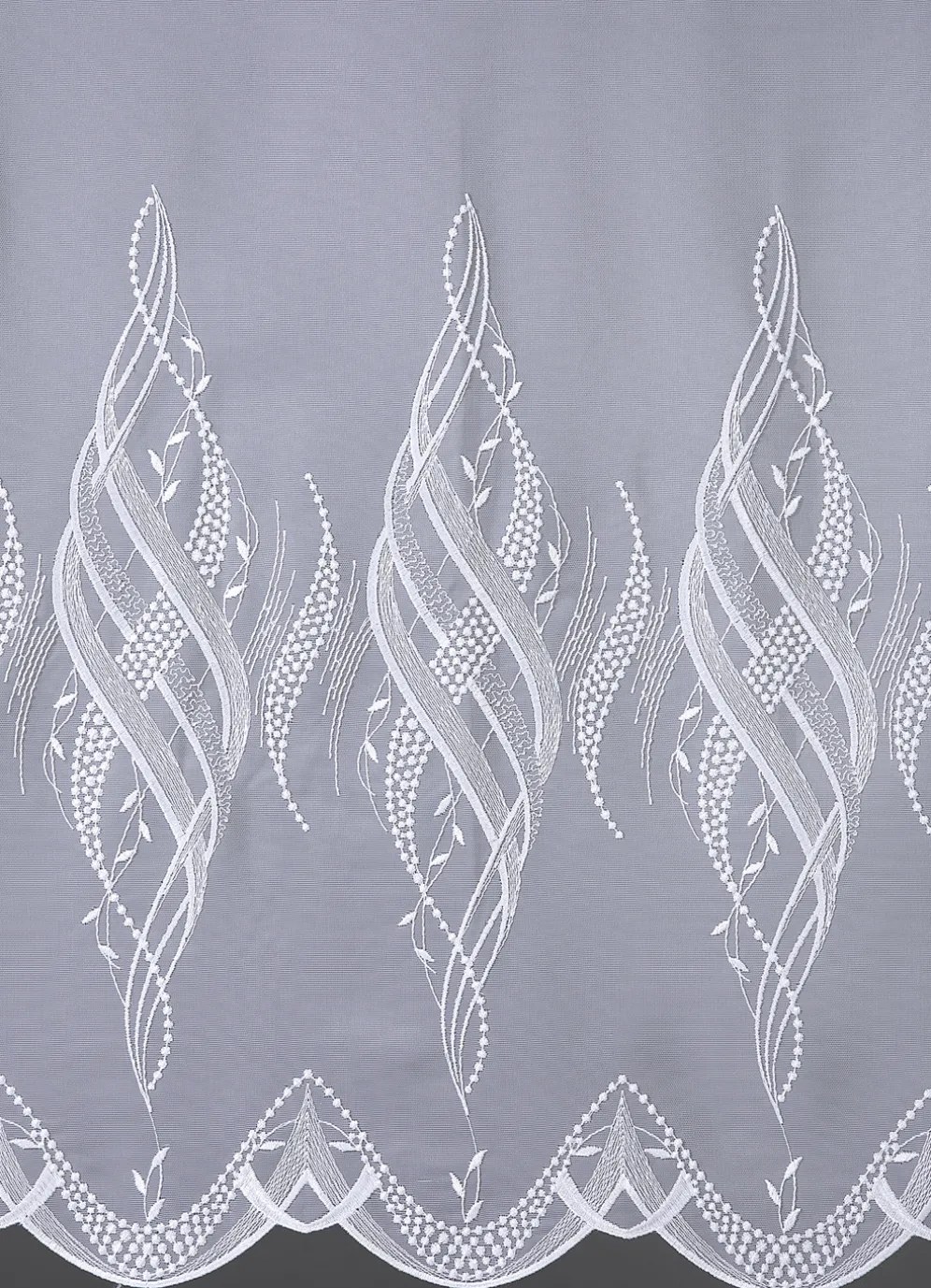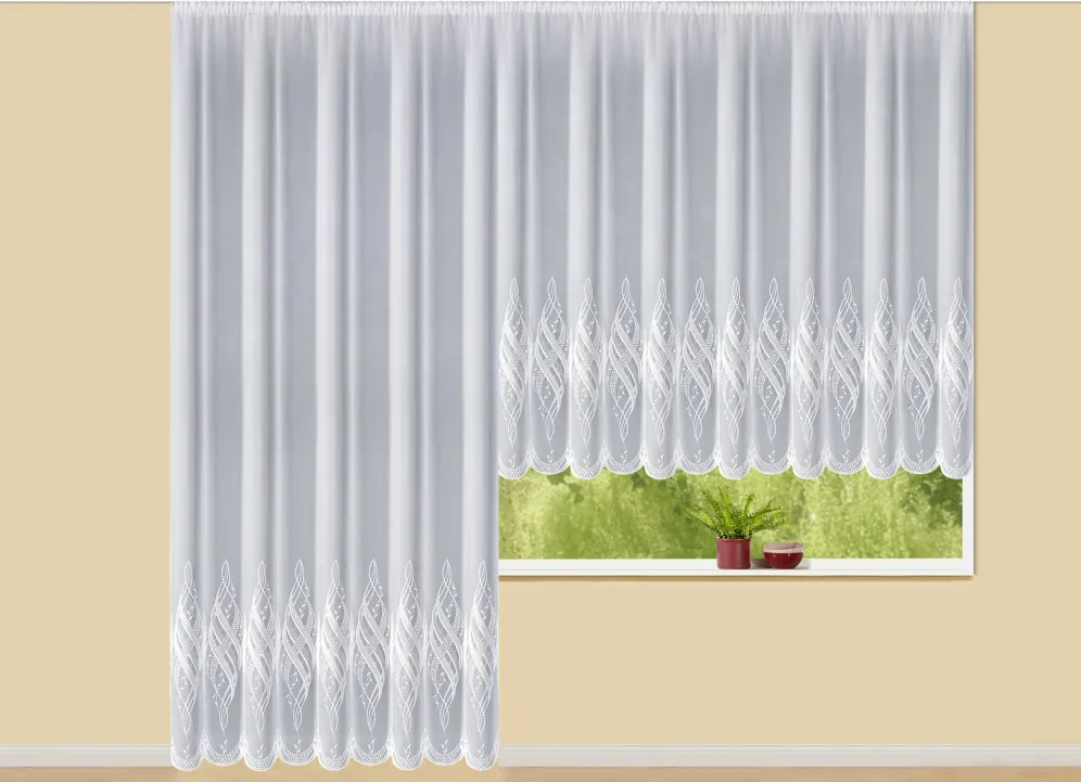 Store mit Plauener Stickerei und Universalschienenband in der Ausführung Modern, in Größe 159 (H145xB250 cm) sowie in Weiss.