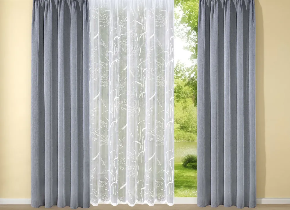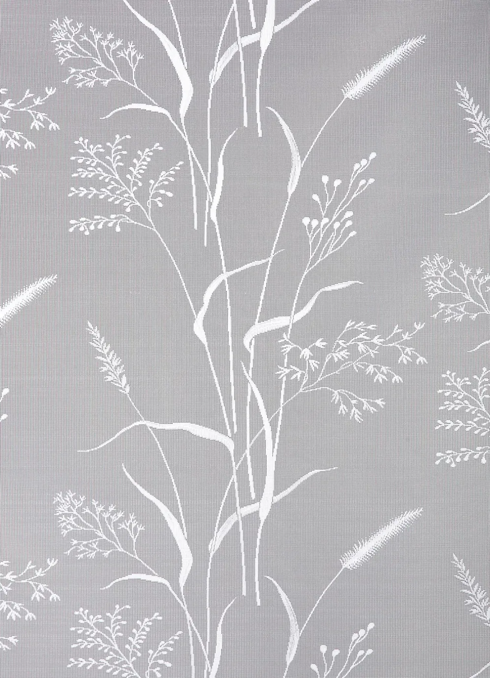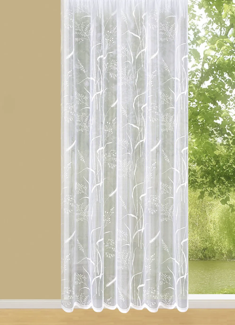 Fein gearbeiteter Store mit Streublumendessin. Universalschienenband. Mit leicht ausgebogtem Abschluss. Qualität: Jaquard aus 100% Polyester.