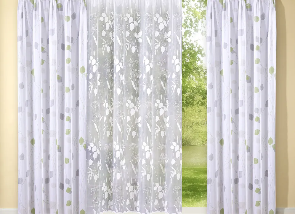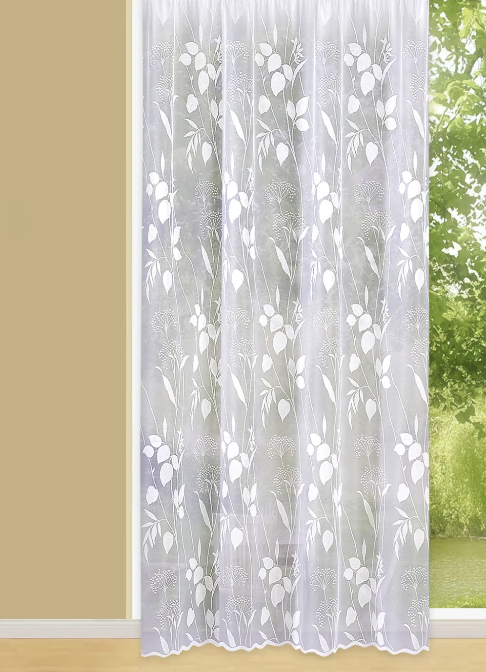 Ein ganz besonderer Blickfang in Ihrem Zuhause ist diese bezaubernde Jacquard Store aus 100% Polyester mit gebogtem Abschluss und Universalschienenband.