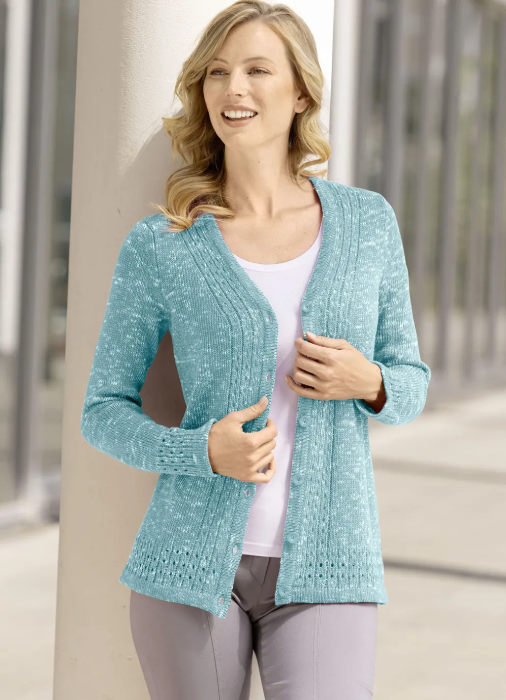 Ein unverzichtbares Kombitalent ist diese durchgeknöpfte Strickjacke aus Melangegarn mit Flammeffekt: V-Ausschnitt, Ajourmuster entlang der Blende, an den Abschlüssen der langen Ärmel und am Saum rundum.
