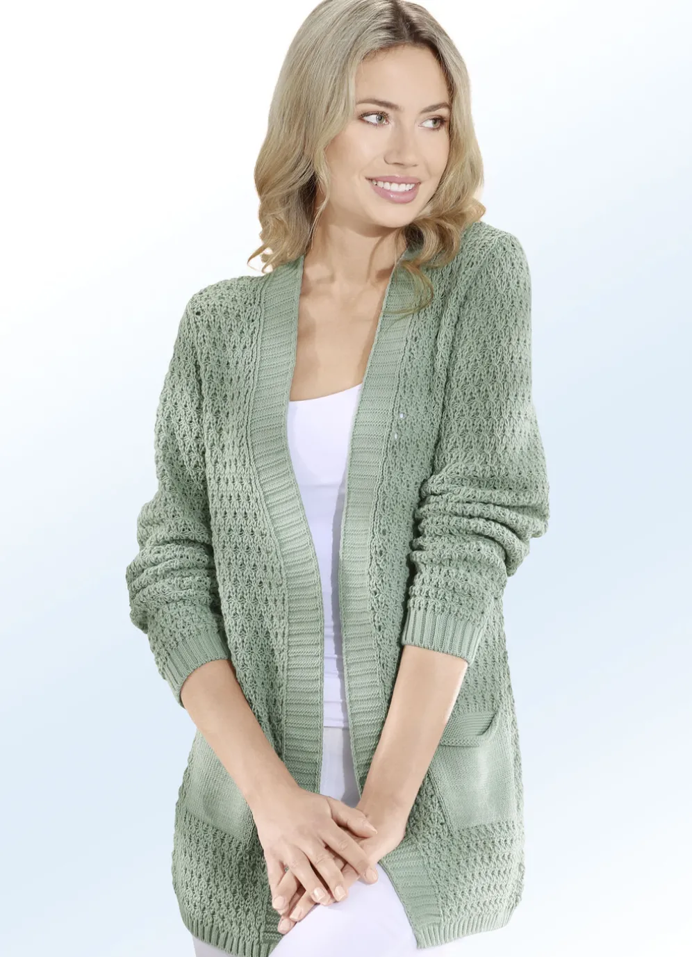 Kuschelig weicher Griff! – Hübsche Strickjacke in verschlussloser Form: dekorative Alloverstruktur, Blende in Biesenoptik, zwei aufgesetzte Taschen mit Rollkante sowie lange Ärmel und Saum mit gerippten Abschlüssen.