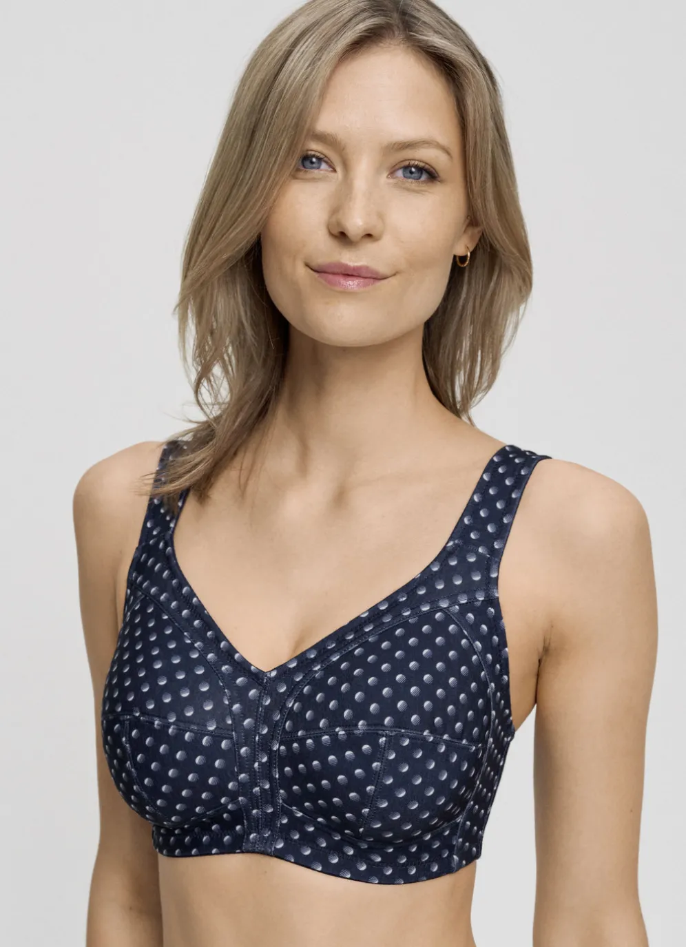 Marinefarbener „Susa“-BH mit hübschem Punktedessin, unterlegtem Vorderteil, seitlichen Stützstäbchen, verstärktem Rückteil sowie breiten, verstellbaren Stretchträgern.