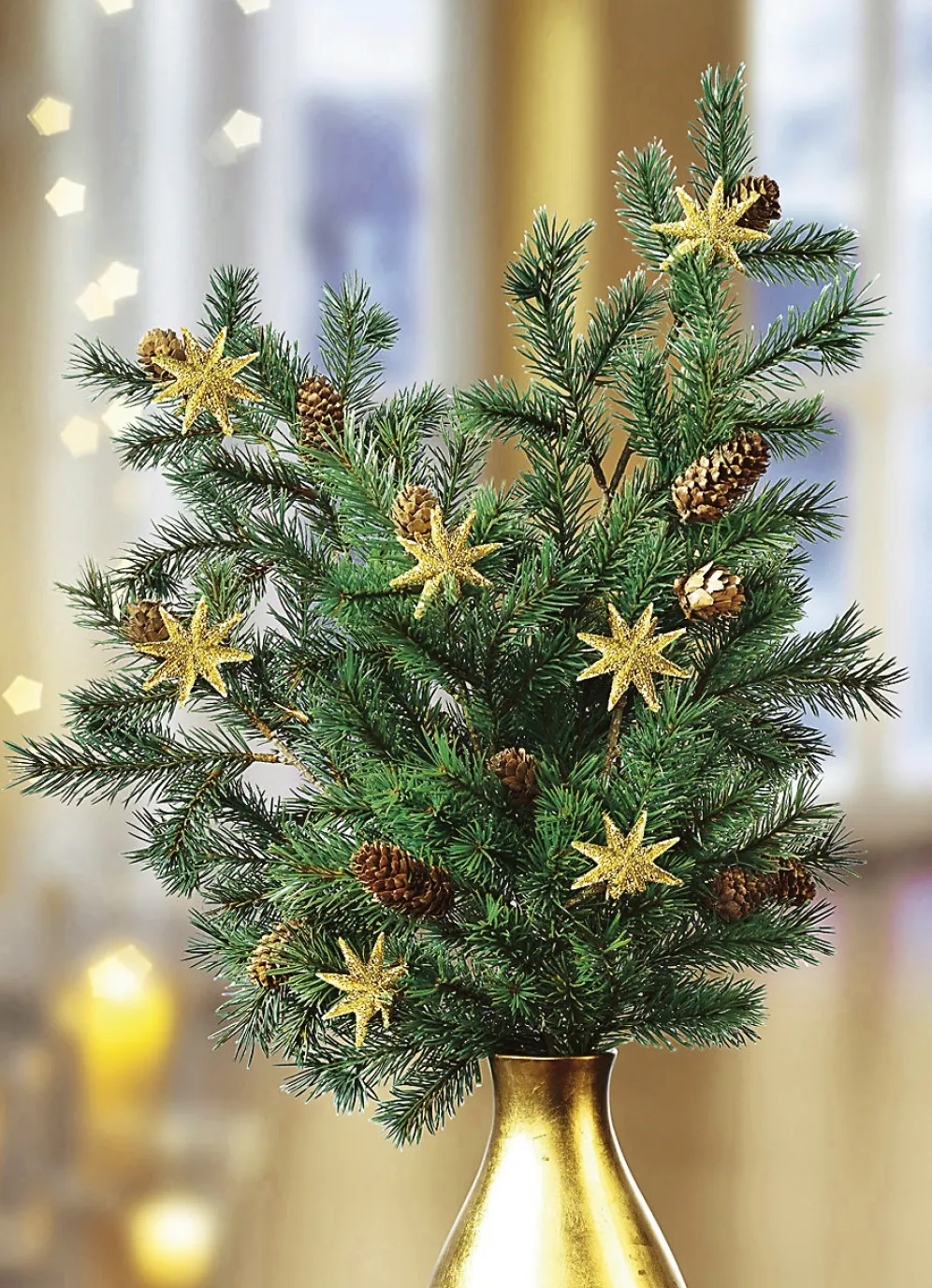 Sie wirken, als hätten Sie sie vom Waldspaziergang mitgebracht, nadeln aber nicht! Diese wunderschönen Tannenzweige wurden aus Kunstmaterial hergestellt und mit echten Zapfen sowie goldfarbenen Sternen verziert. Lieferung ohne Vase. Maße: Länge je ca. 65 cm