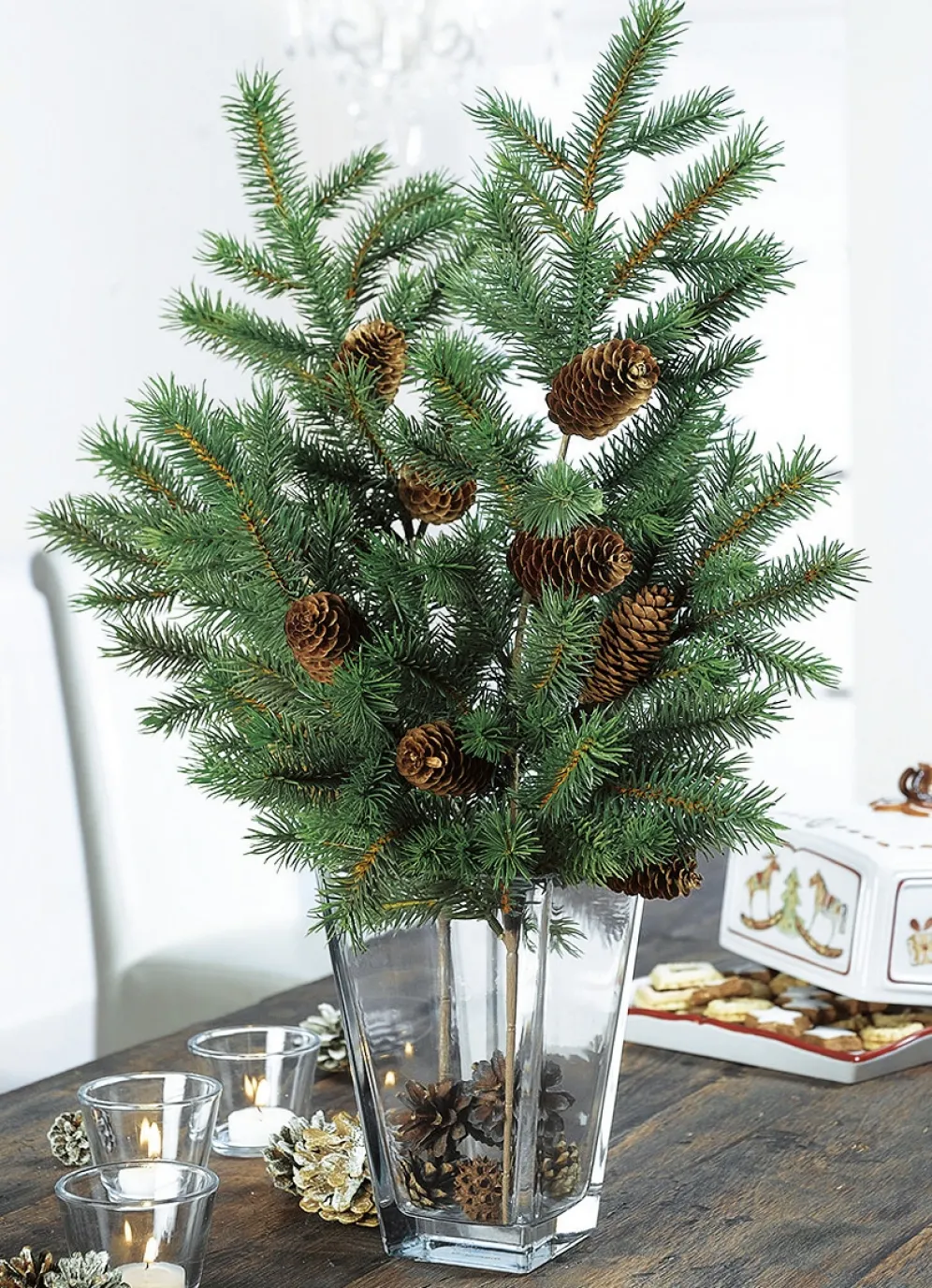 Diese Tannenzweige wirken, als hätten Sie sie von einem Waldspaziergang mitgebracht, nadeln aber nicht! Nur die Zapfen sind echt, die Tanne ist aus Kunstmaterial. Lieferung ohne Glasvase. Maße: ca. Höhe je 65 cm