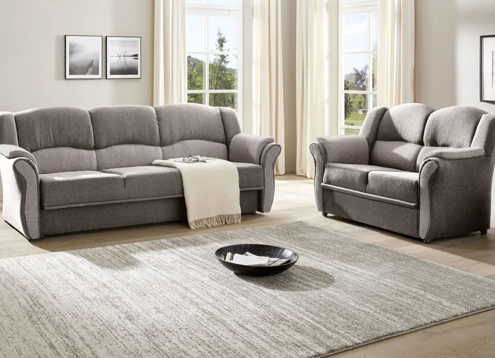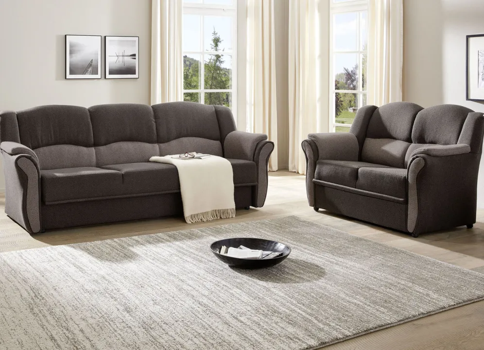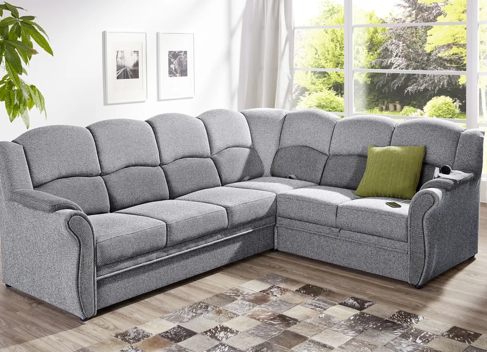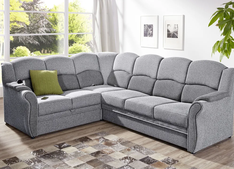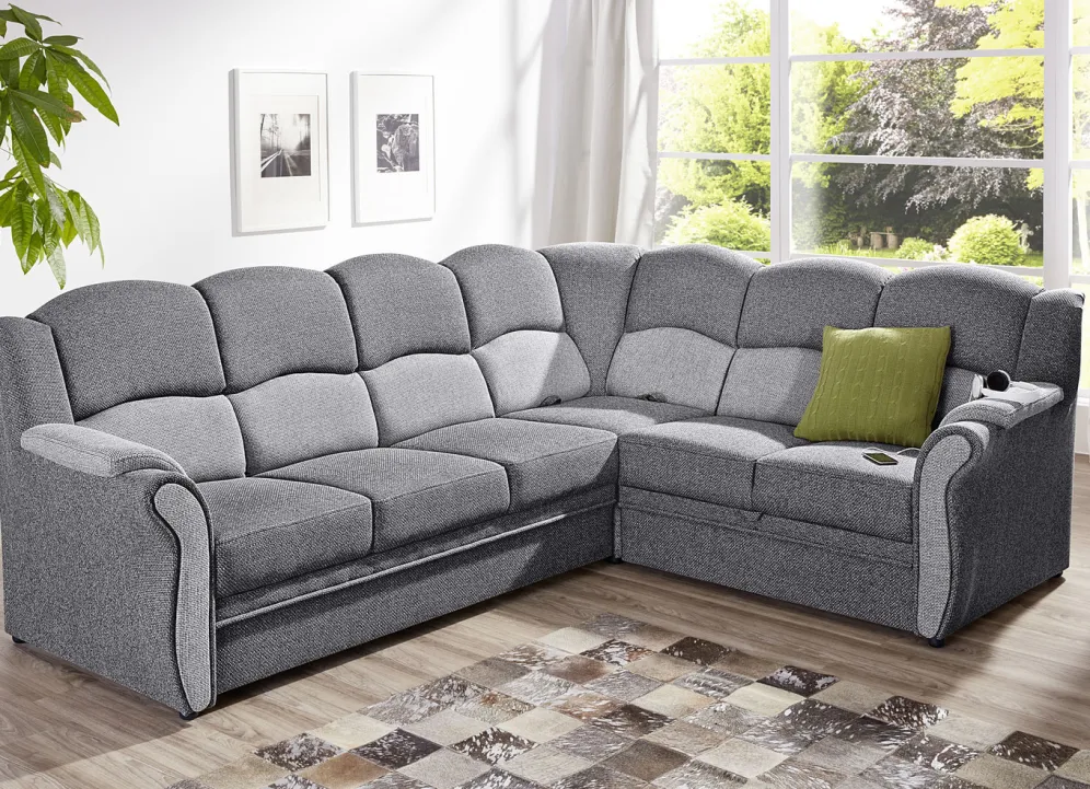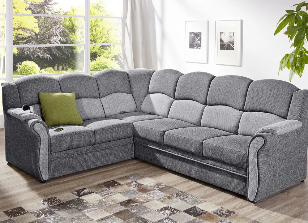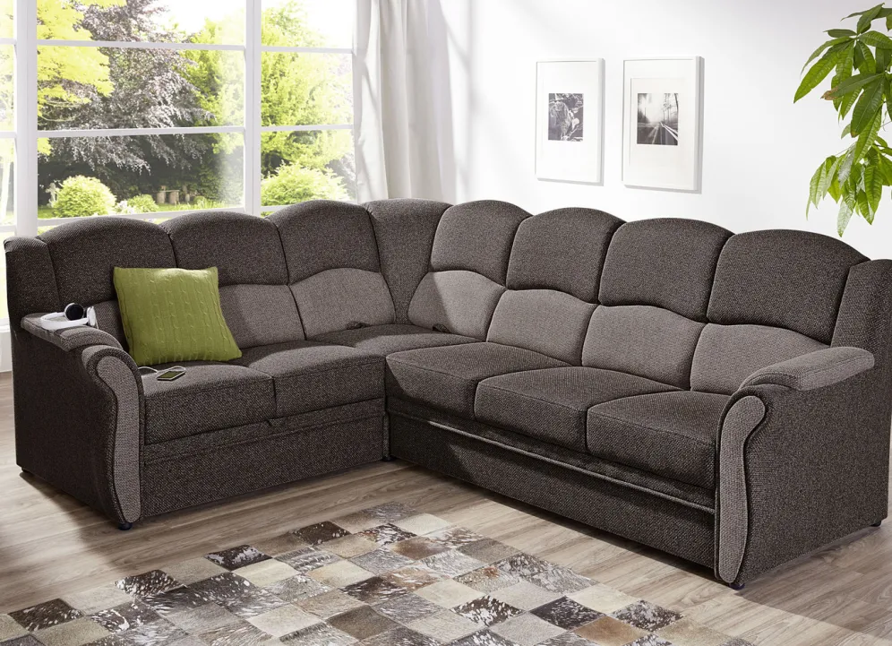 Polstermöbel auf stabilem, teilmassivem Holzgrundgestell. Mit Federkern und Schaumstoffpolsterung so wie 57 cm hohem, geschwungenem Rückteil. Mit auffallendem, zweifarbigen Bezug aus 100% Polyester. Polsterecke wahlweise mit oder ohne Bettfunktion mit Bettkasten erhältlich. Rückseiten mit Originalstoff bezogen, daher frei im Raum aufstellbar. (Dreisitzer mit Spannstoff bezogen).