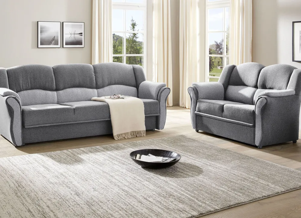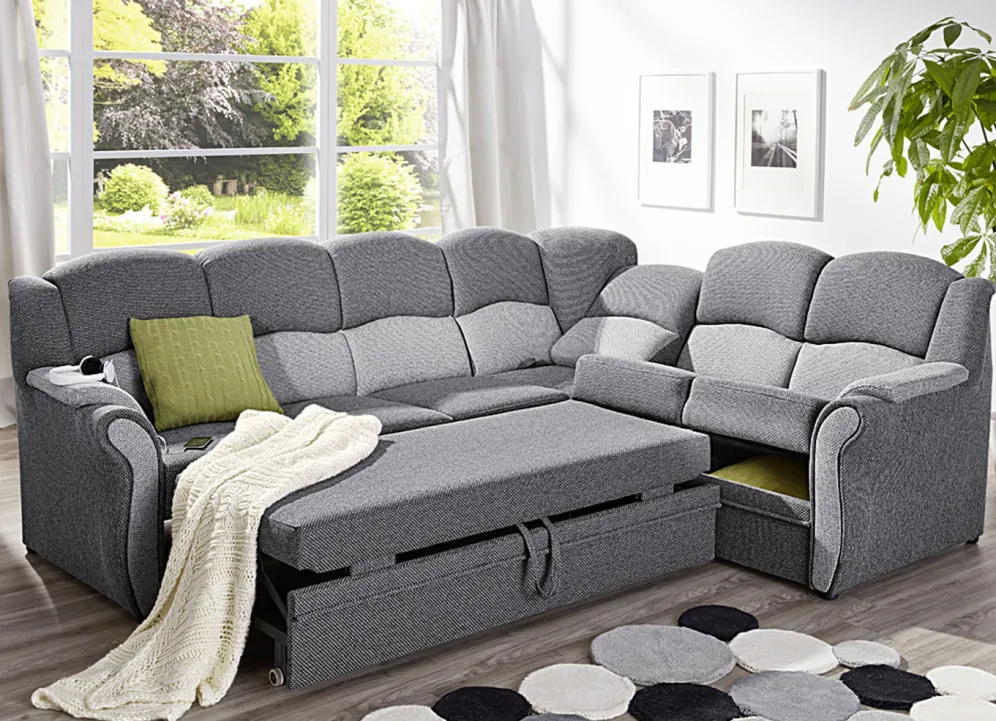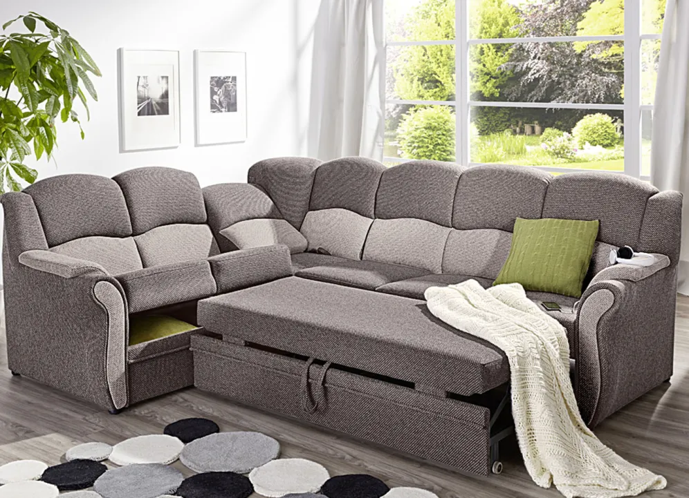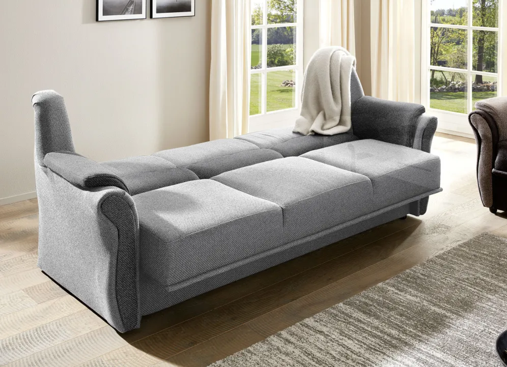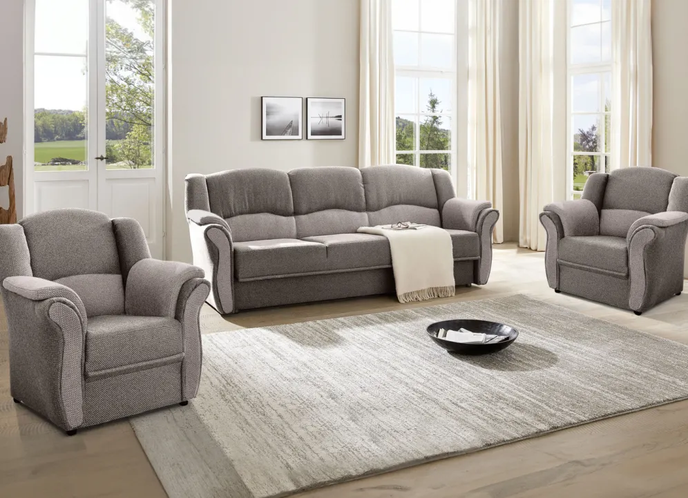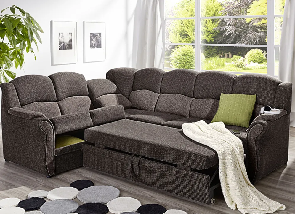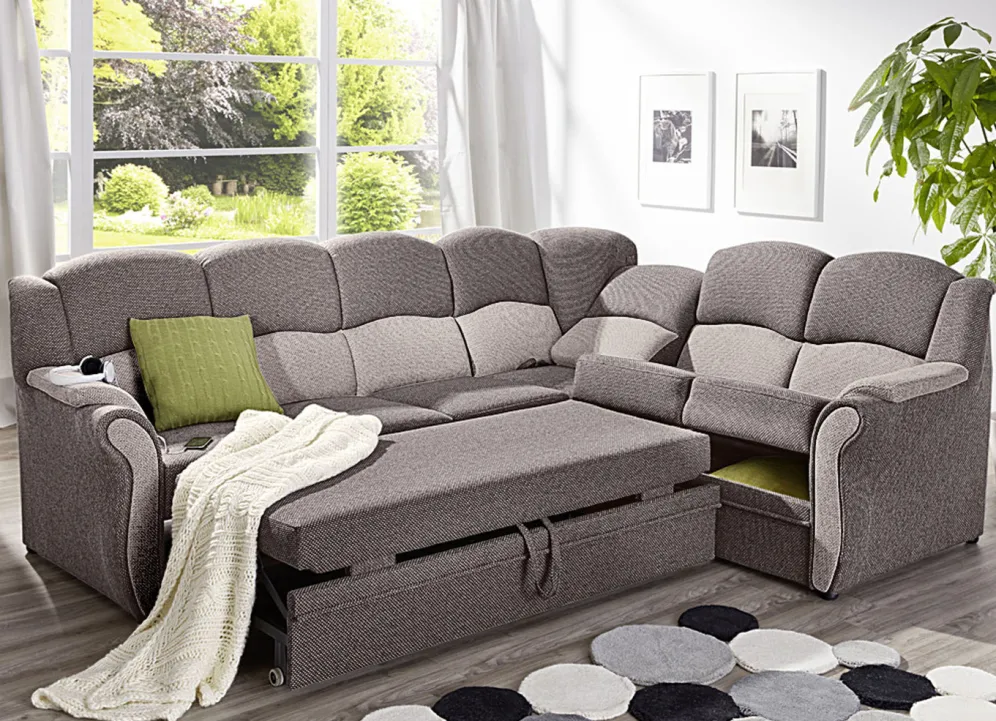 Polstermöbel auf stabilem, teilmassivem Holzgrundgestell. Mit Federkern und Schaumstoffpolsterung so wie 57 cm hohem, geschwungenem Rückteil. Mit auffallendem, zweifarbigen Bezug aus 100% Polyester. Polsterecke wahlweise mit oder ohne Bettfunktion mit Bettkasten erhältlich. Rückseiten mit Originalstoff bezogen, daher frei im Raum aufstellbar. (Dreisitzer mit Spannstoff bezogen).