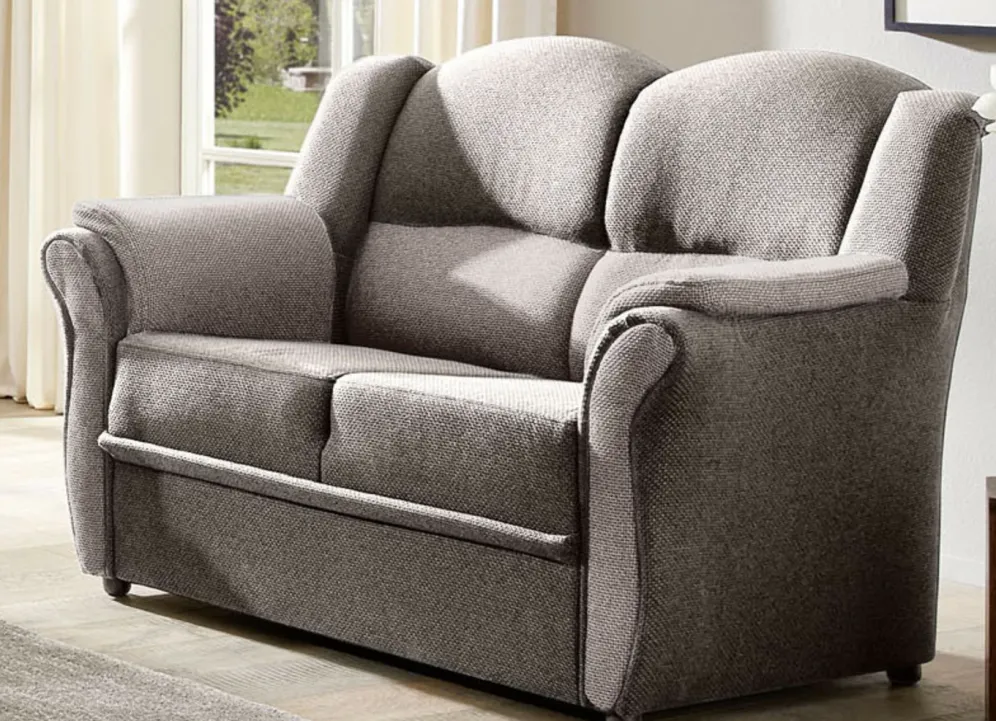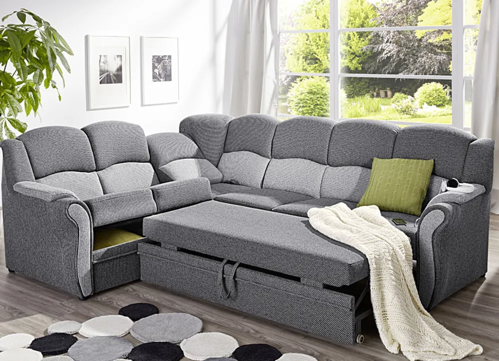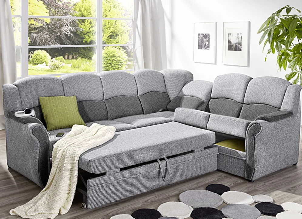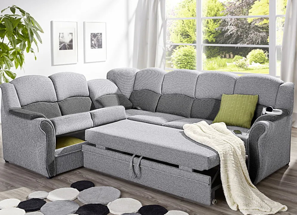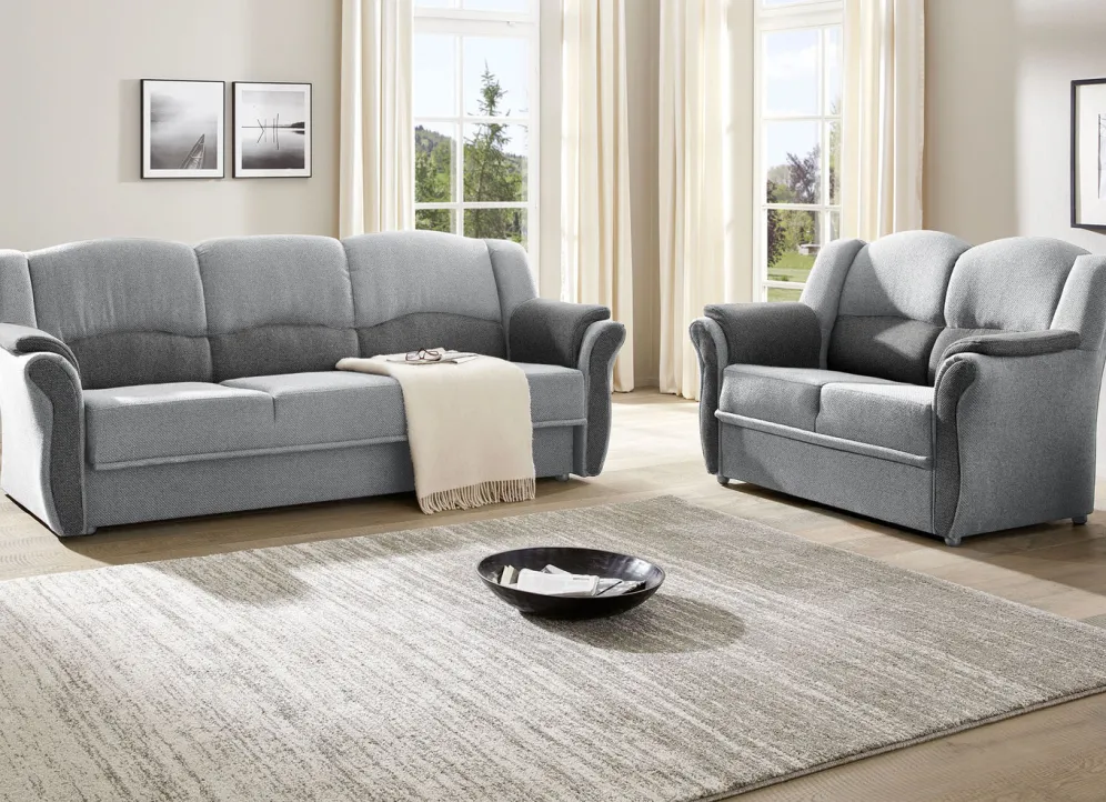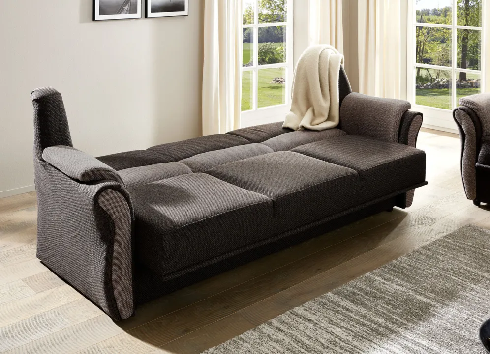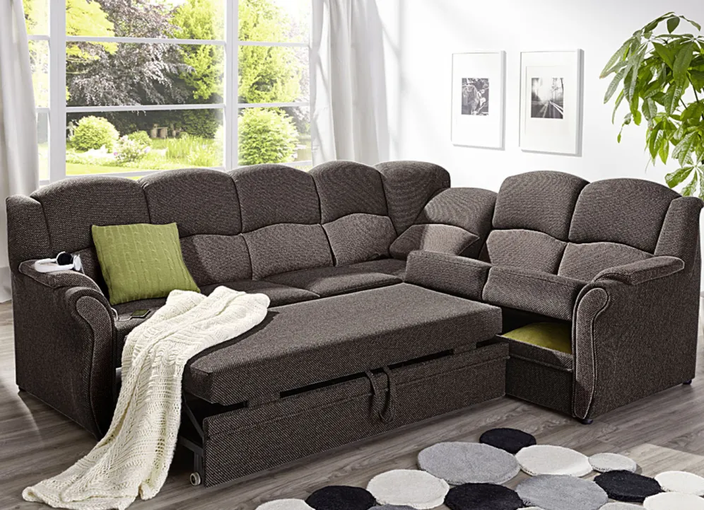 Polstermöbel auf stabilem, teilmassivem Holzgrundgestell. Mit Federkern und Schaumstoffpolsterung so wie 57 cm hohem, geschwungenem Rückteil. Mit auffallendem, zweifarbigen Bezug aus 100% Polyester. Polsterecke wahlweise mit oder ohne Bettfunktion mit Bettkasten erhältlich. Rückseiten mit Originalstoff bezogen, daher frei im Raum aufstellbar. (Dreisitzer mit Spannstoff bezogen).