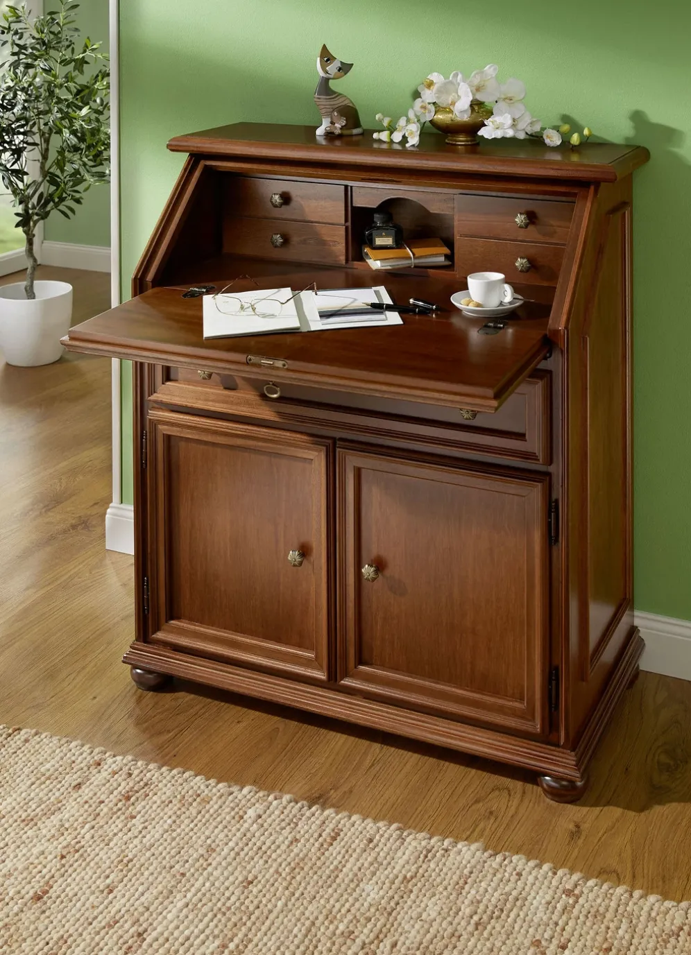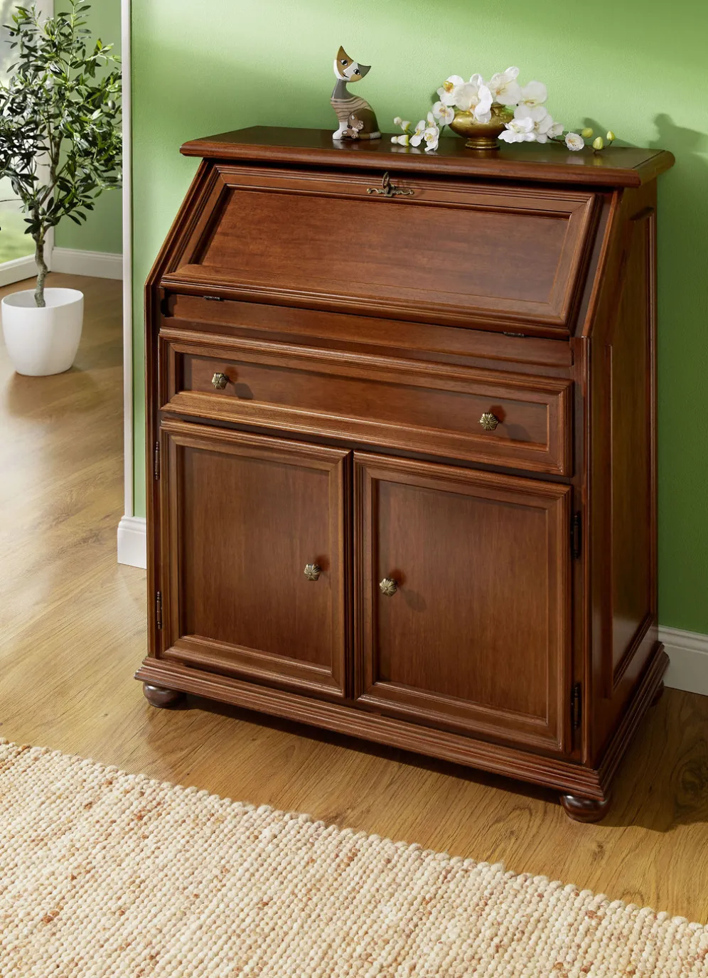 Wunderbar stilsicherer, teilmassiver Sekretär mit typisch italienischem Charme, detailverliebter Verarbeitung, Echtholzfurnier und Kugelfüßen. Mit 2 großen Türen, dahinter 1 Einlegeboden, darüber 1 breite Schublade und 1 große Klappe. Hinter der Klappe 4 kleine Schubladen und 1 offenes Fach. Schubladen, Türen und Klappen mit schönen, goldfarbenen Metallknöpfen.