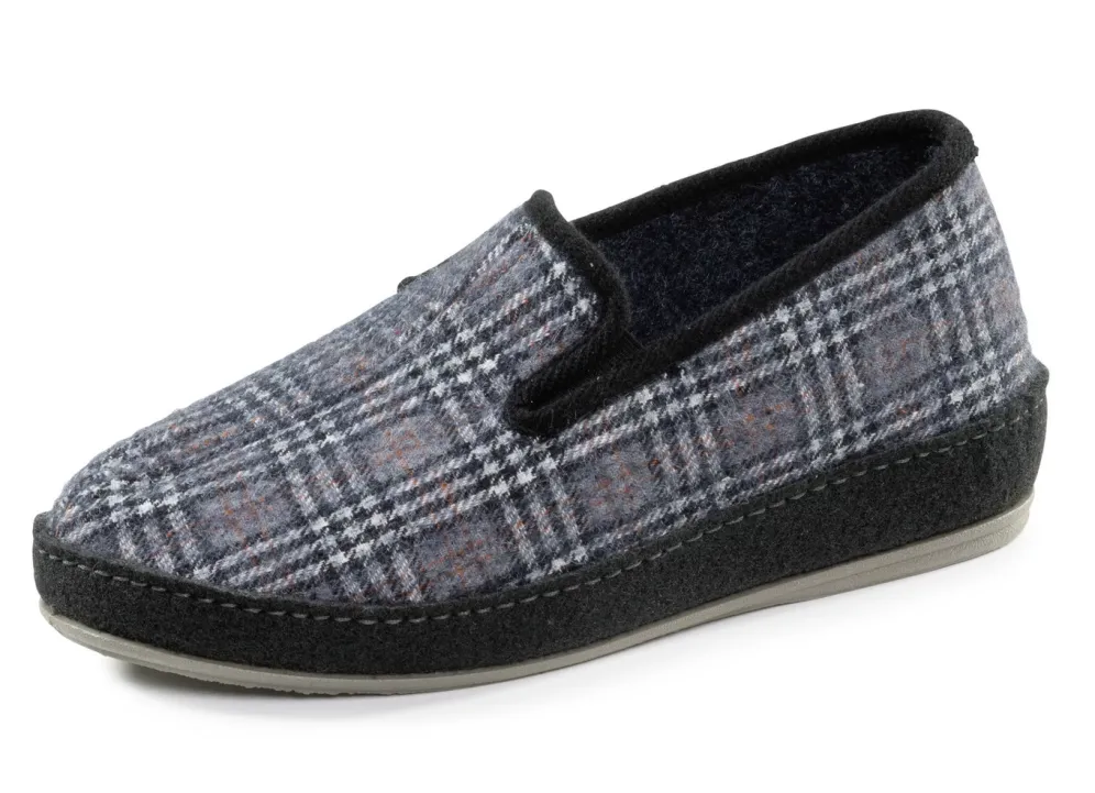 Karierter Textil-Hausschuh in Blaugrau-Multicolor: anatomisch geformtes Fußbett mit Fersenluftpolster, Filzschalensohle sowie TR-Laufsohle