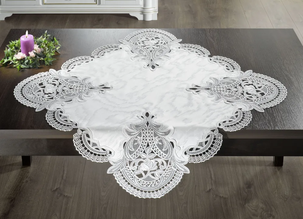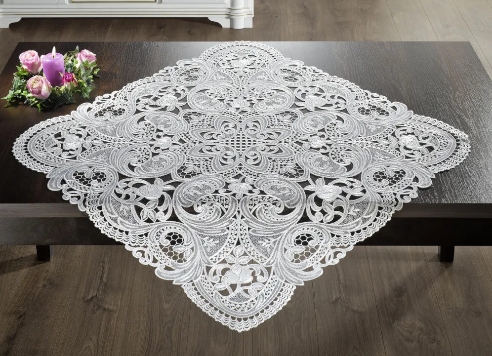 Diese stilvolle, hochwertige Tisch- und Raumdekoration aus echter Plauener Spitze mit filigran gearbeiteten Rosen wird Ihren Wohnbereich verzaubern. Wahlweise aus Vollspitze oder mit klassischem Stoffeinsatz. Die Qualität: 100% Polyester. Waschbar bis 30 °C.