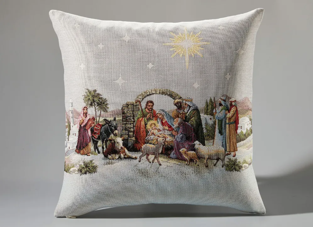 Auf diesen festlich gestalteten Wohnaccessoires wird die Geburt Jesu Christi mit liebevollen Details in eindrucksvoller Weise dargestellt. Kissenbezug mit praktischem Reißverschluss. Die Qualität: Gobelin aus 75% Polyester, 22% Baumwolle und 3% Polyacryl. Waschbar bis 30 °C