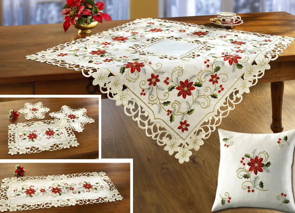 Weihnachtliche Blüten mit üppigen Blättern zieren diese traumhafte Tisch- und Raumdekoration. Eingefasst von durchbrochem gearbeitetem, verschlungenem Blattwerk. Kissenbezug mit Reißverschluss.