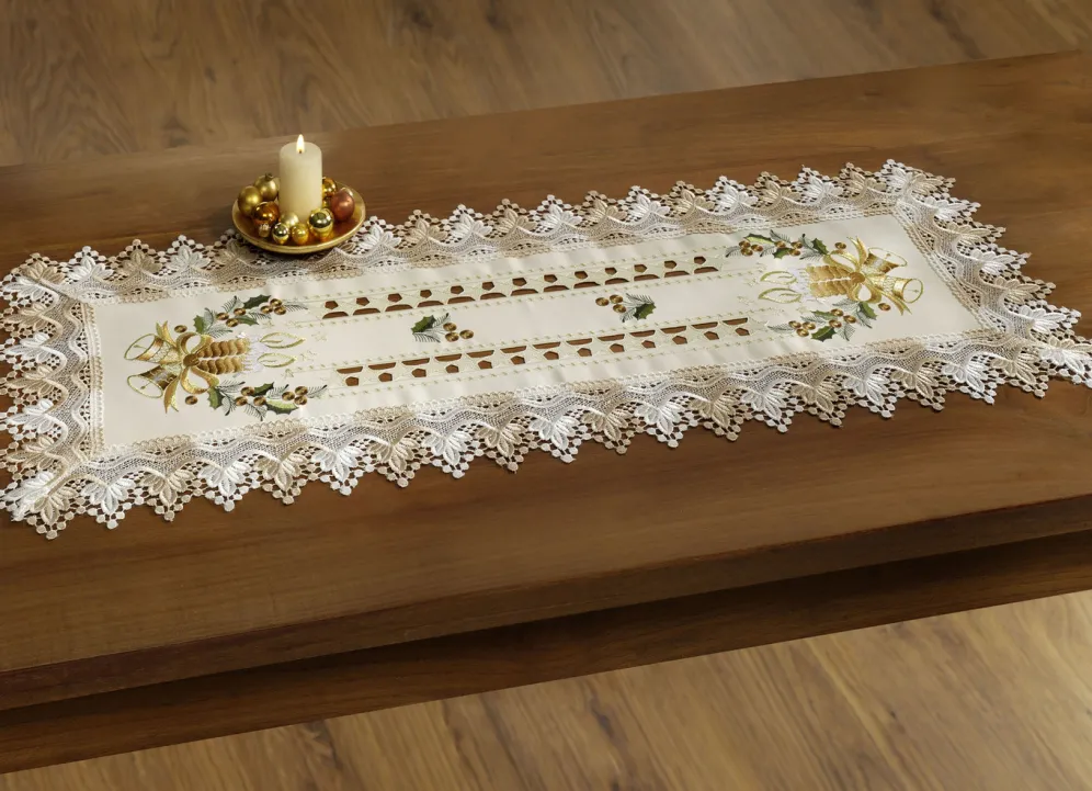 Tisch- und Raumdekoration mit weihnachtlichen Kerzenmotiven in Größe 101 (Deckchen, 35/ 50 cm) und in Ecru-Bunt.