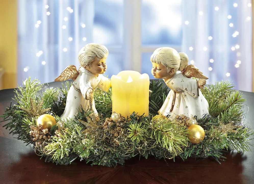 Traumhaft schönes Tischgesteck mit LED-Echtwachskerze, das liebevoll mit Tannenzweigen aus Kunstmaterial, goldfarbenen Kugeln, Sternen und Engelshaar verziert ist. Das besondere Highlight sind die beiden Engelsfigürchen aus Polyresin, die versuchen, die Kerze auszupusten. Batteriebetrieben mit 1x Knopfzelle CR2032 (im Lieferumfang enthalten).