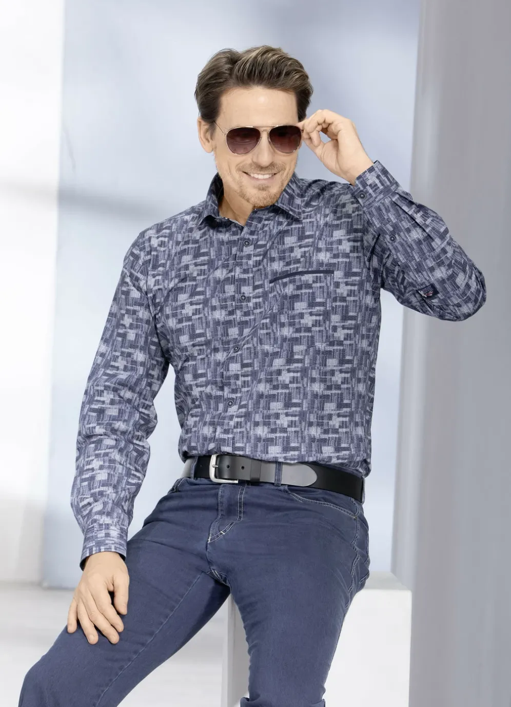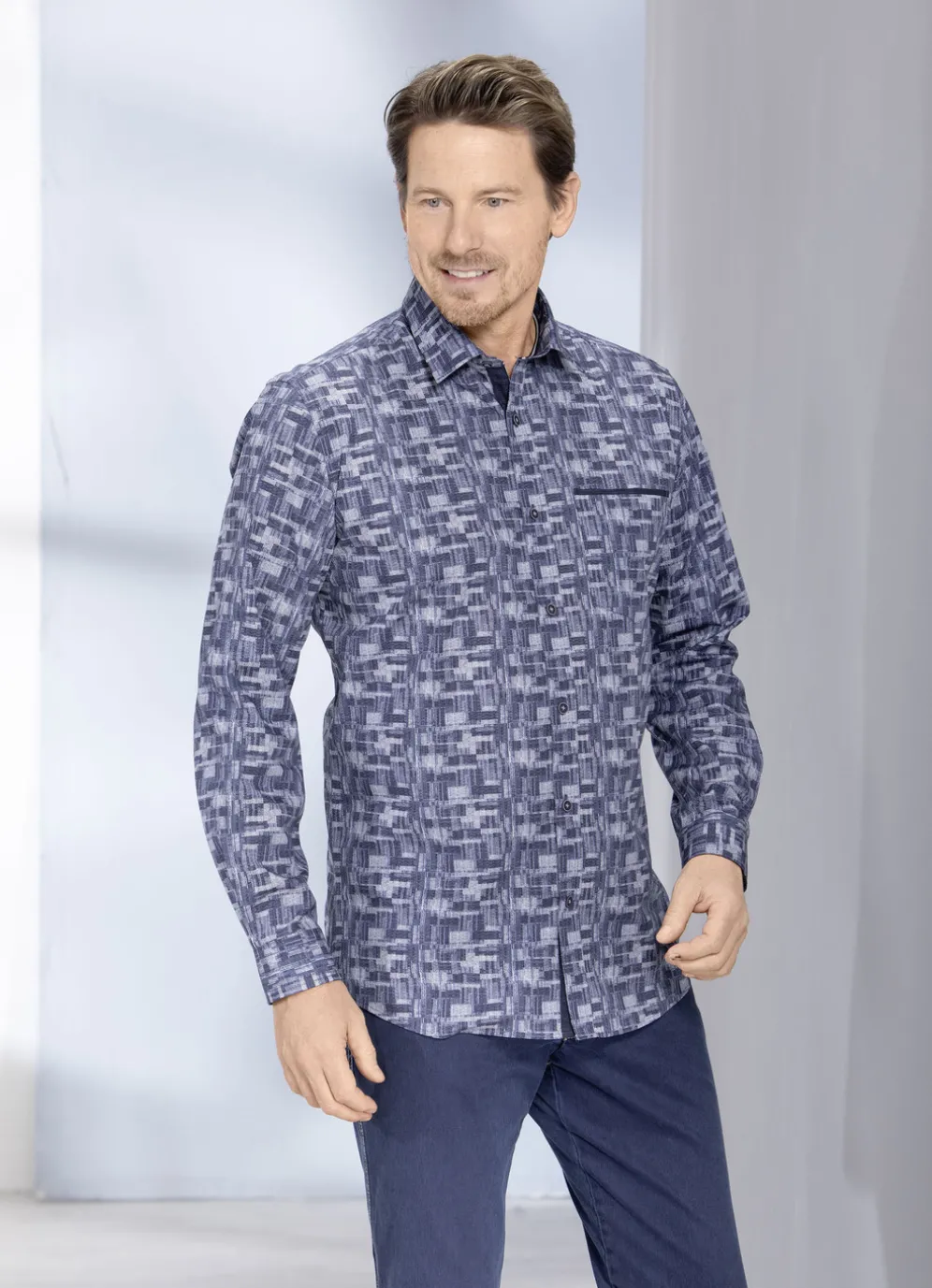 Lässiges, blau dessiniertes „Milano Italy”- Hemd mit Ärmelschlitzbesatz, Brusttasche mit Kontrastbesatz, Manschetten mit Verstellknopf, Rückenpasse mit Zierriegel sowie Knopfleisten- und Manschetteninnenseite mit Kontrastbesatz.