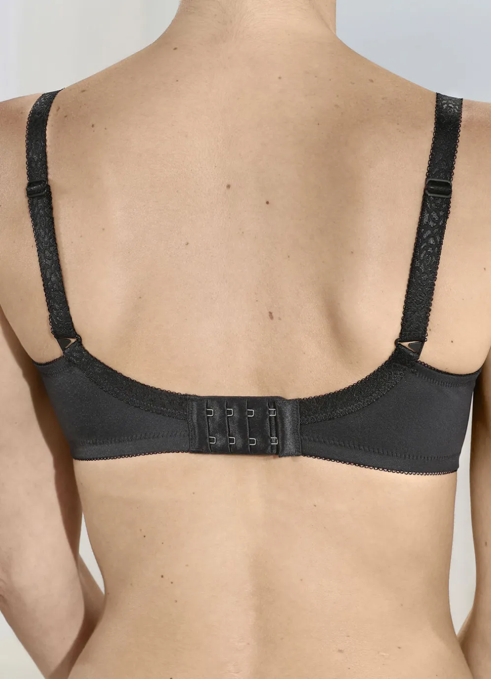 „Triumph-Amourette“-Minimizer-Bügel-BH mit unterlegter Elastikspitze im Vorderteil, vorgeformten Cups sowie verstellbaren Stretchträgern.