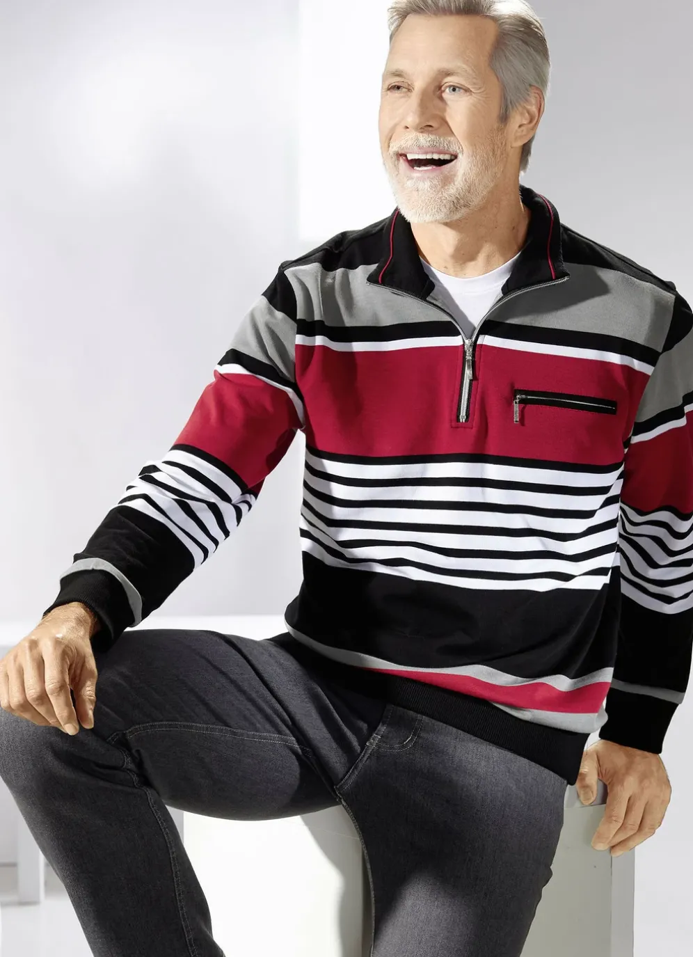 Dieser trendige Troyer in Schwarz-Weiß-Rot-Grau präsentiert sich mit kurzem Reißverschluss, einer Brusttasche mit Reißverschluss links sowie elastischen Bündchen-Abschlüssen an den Ärmeln und am Saum.