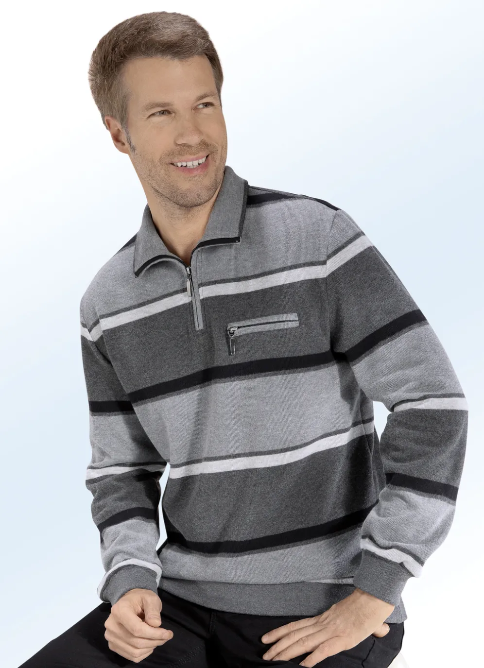 Das Besondere an diesem sportiven Troyer ist das garngefärbte, hellgrau-anthrazit-schwarz melierte Ringel-Dessin allover. Mit kurzem Reißverschluss, Brusttasche mit Reißverschluss sowie elastischen Bündchen-Abschlüssen an den Ärmeln und am Saum.