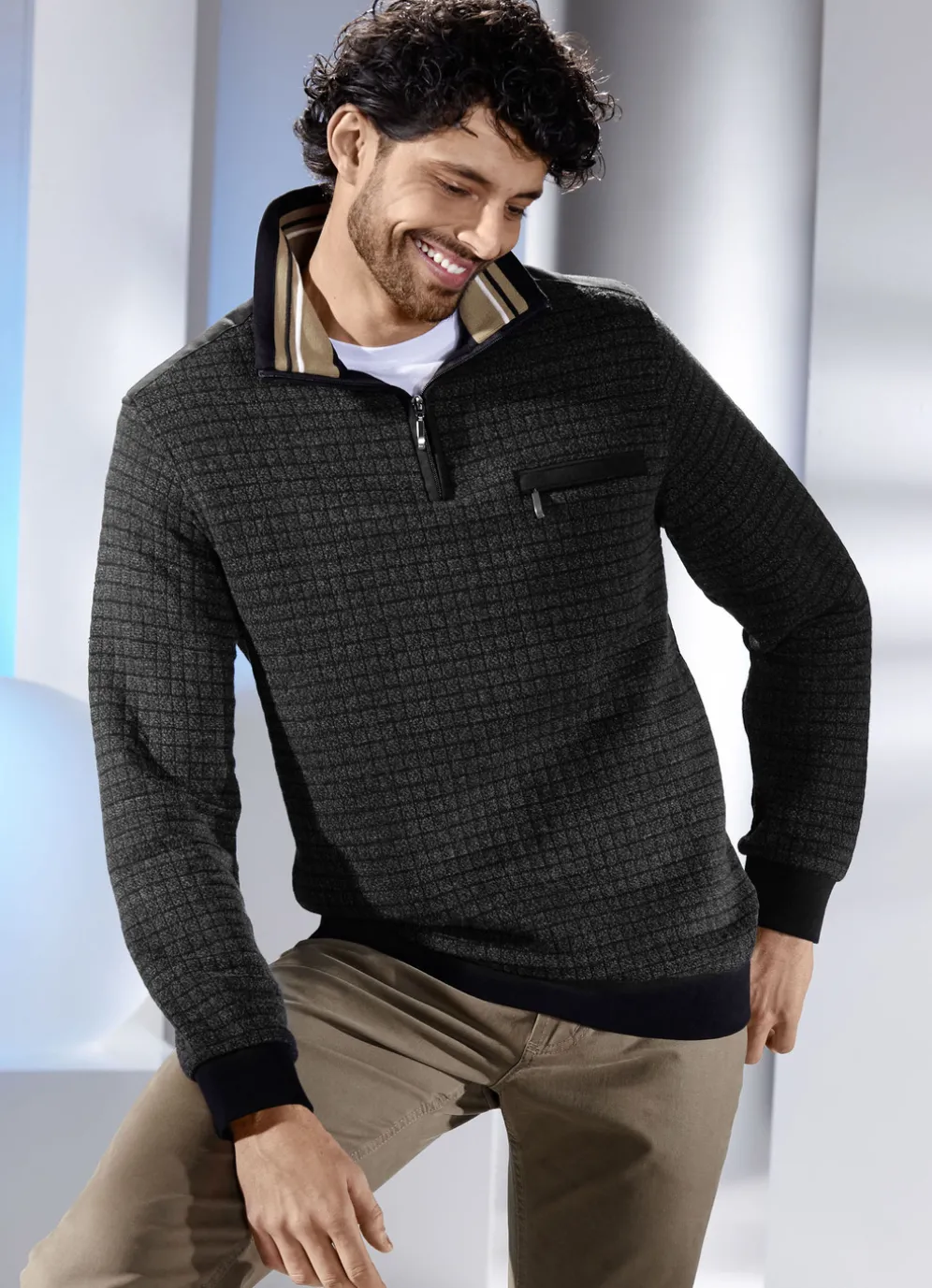Anthrazit melierter Troyer mit Kontrastbesatz am Kragen, kurzem Reißverschluss, einer Brusttasche links mit Reißverschluss sowie elastischen Bündchen-Abschlüssen an den Ärmeln und am Saum.