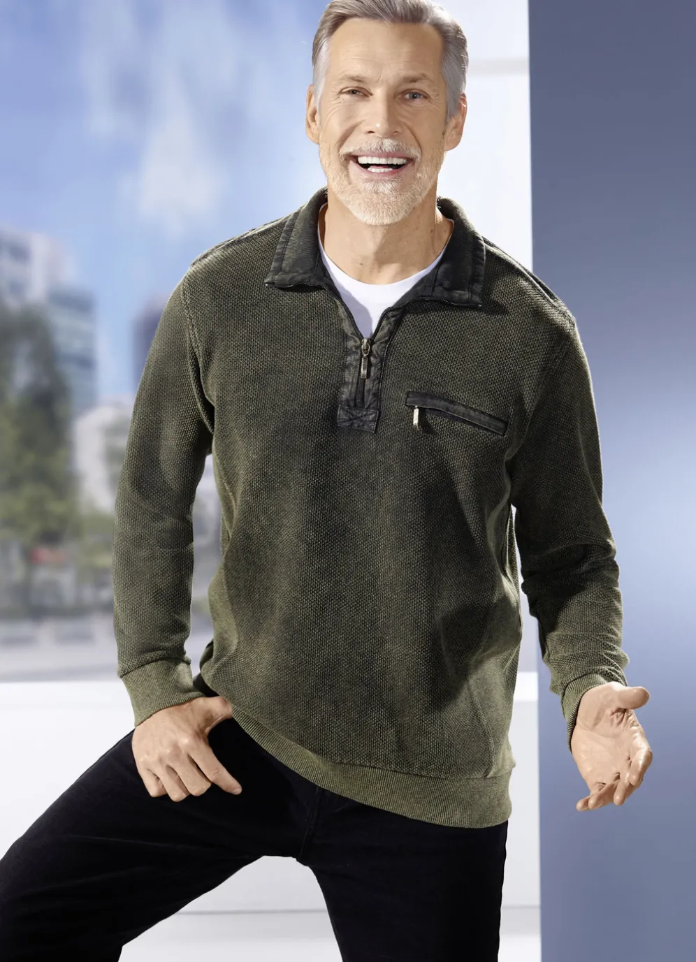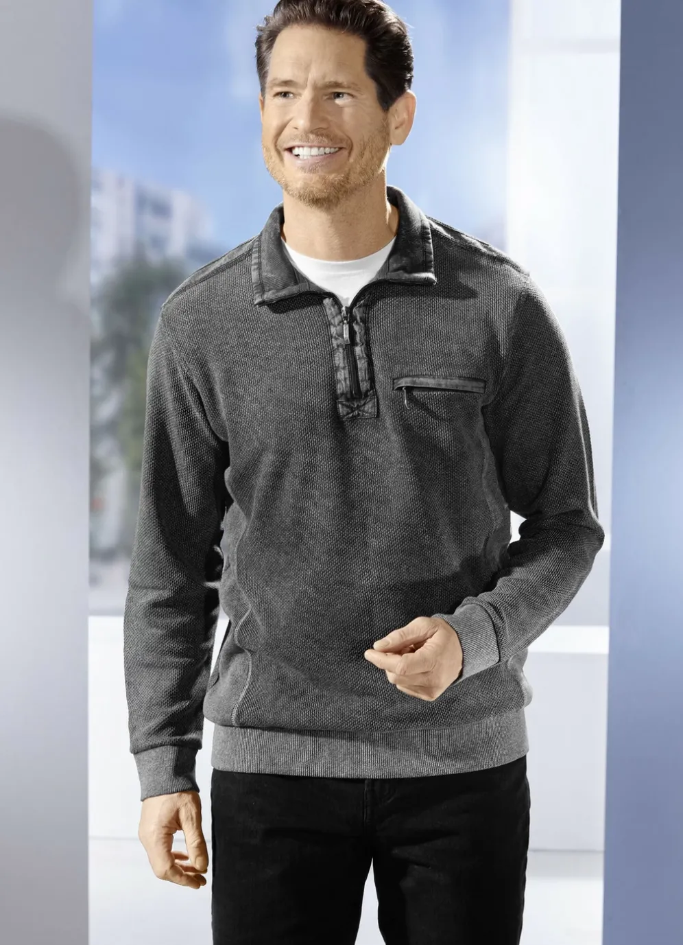 Stilsicherer Troyer mit kurzem Reißverschluss, einer Reißverschluss-Brusttasche links, elastischen Einsätzen seitlich sowie elastischen Bündchen-Abschlüssen an den Ärmeln und am Saum.