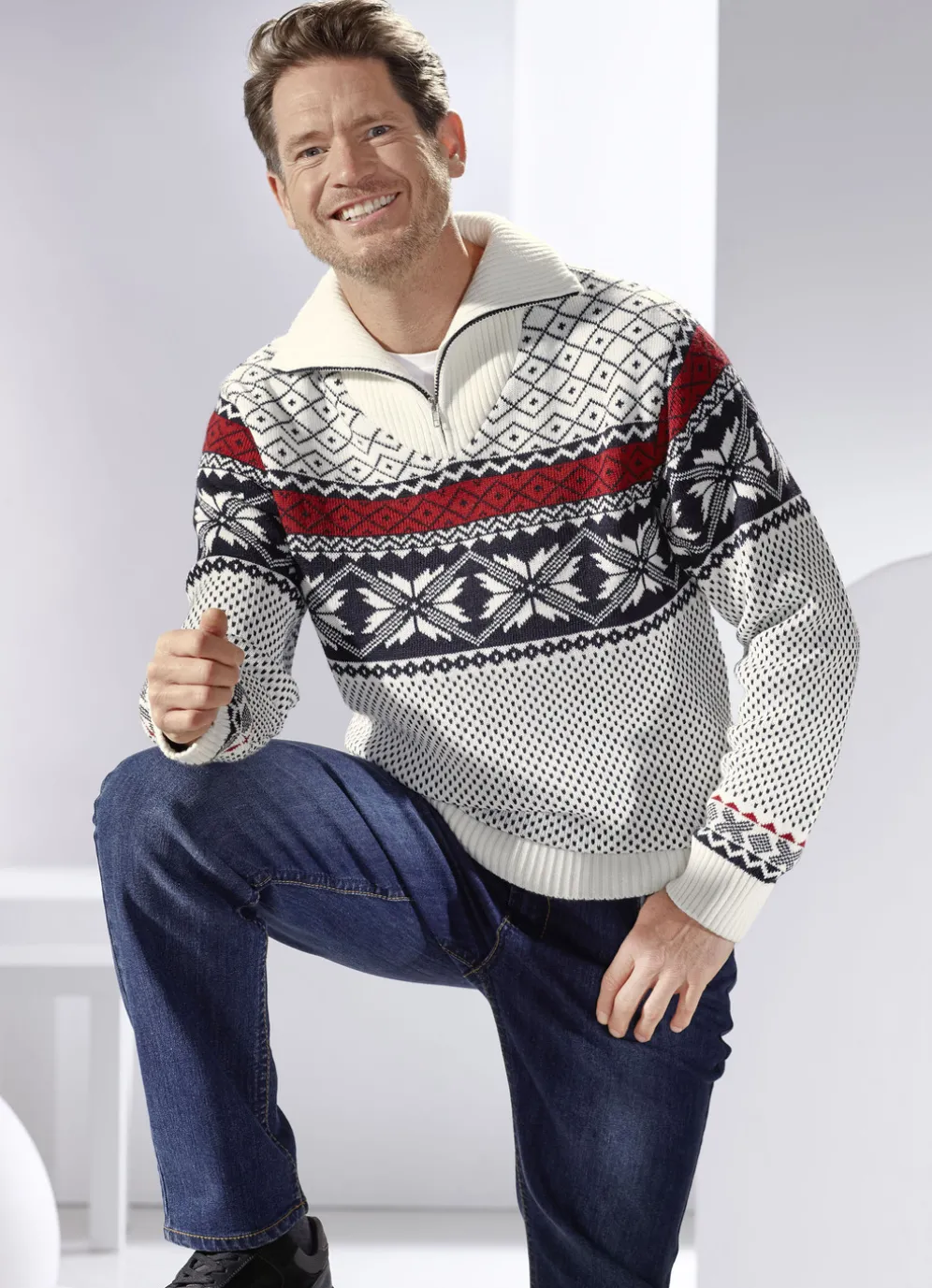 Stilsicherer Troyer mit aufwendigem Norwegermuster in harmonischem Wollweiß-Marine-Rot allover, kurzem Reißverschluss sowie Rippenstrick- Abschlüssen.