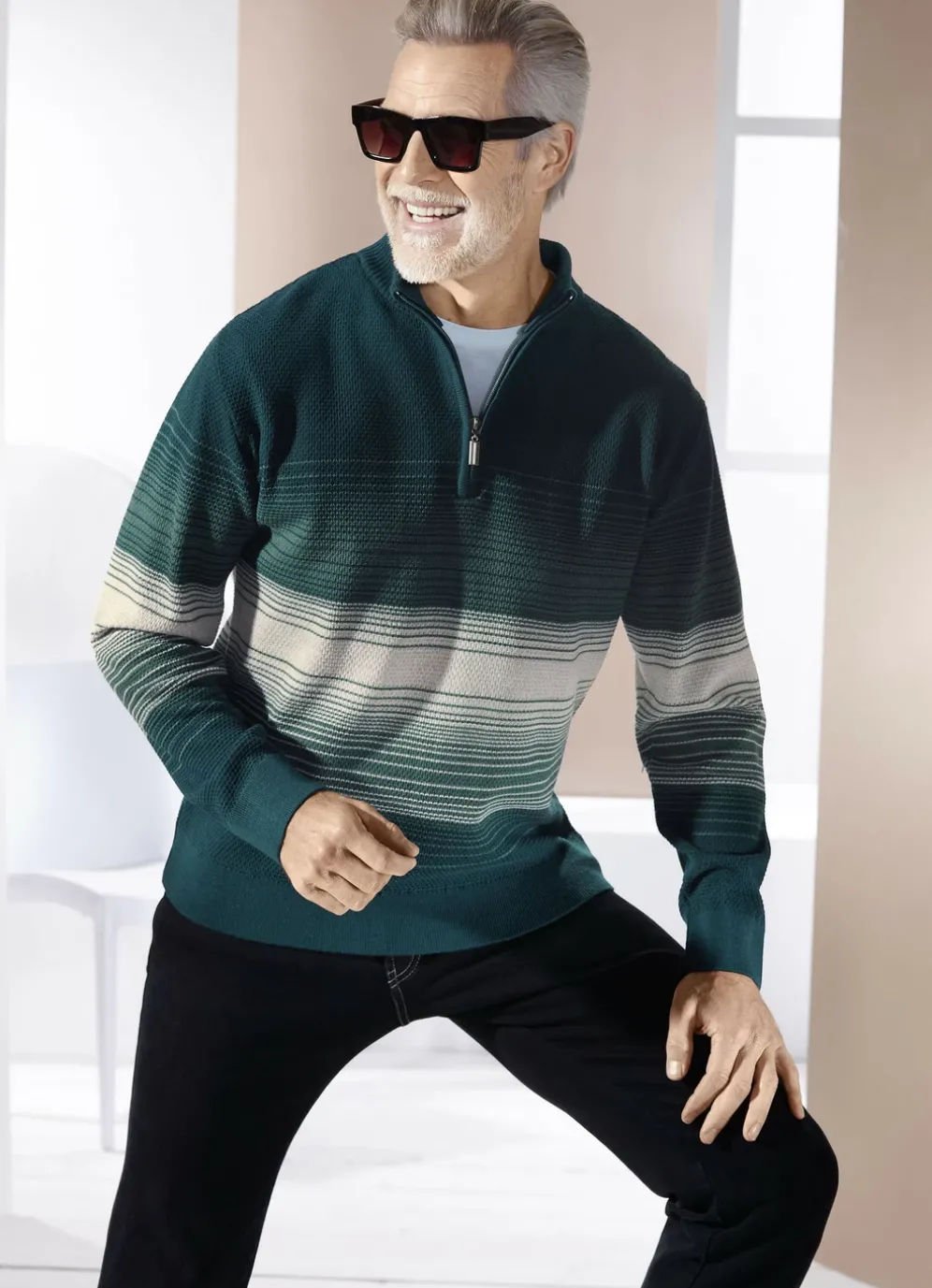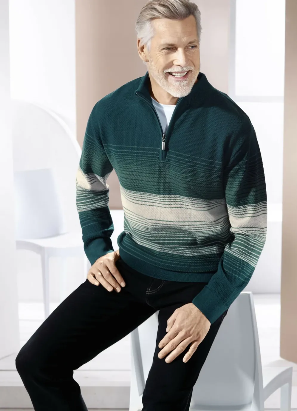 Attraktiver, gemusterter Troyer mit Stehkragen, Strukturmix allover, langen Ärmeln sowie Rippenstrick- Abschlüssen.