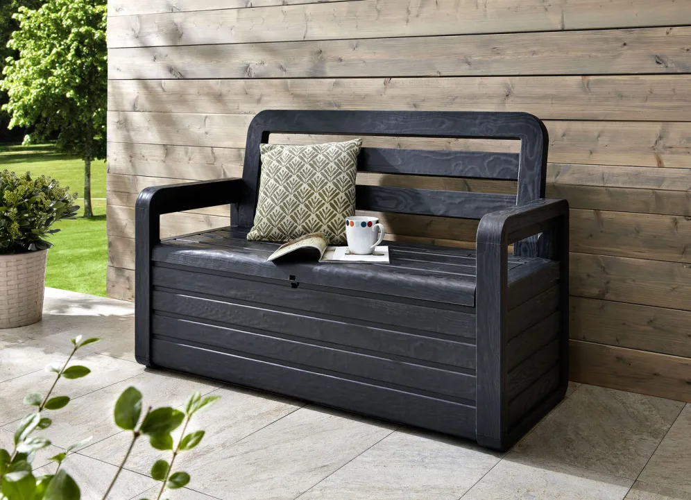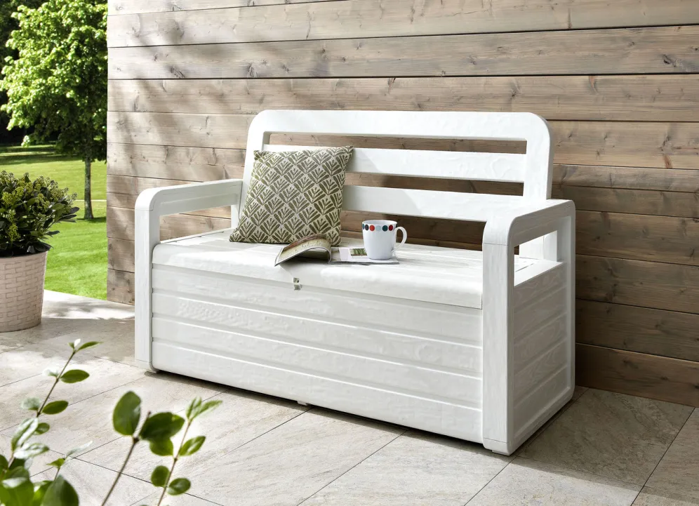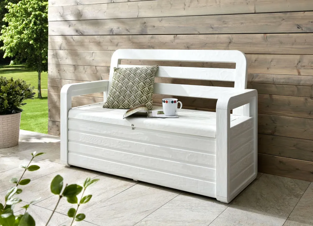 Sie sieht einer echten Holz-Gartenbank zum Verwechseln ähnlich, ist aber aus hochwertigem UV-beständigem Kunststoff gefertigt. Wetterfester Stauraum, stabile Sitzgelegenheit und dekoratives Einrichtungselement – alles vereint in dieser schönen Gartenbank.