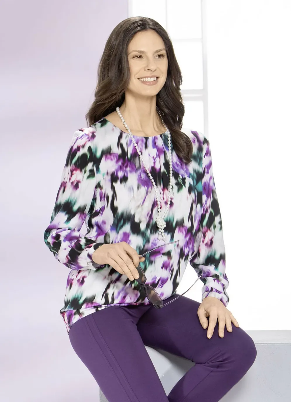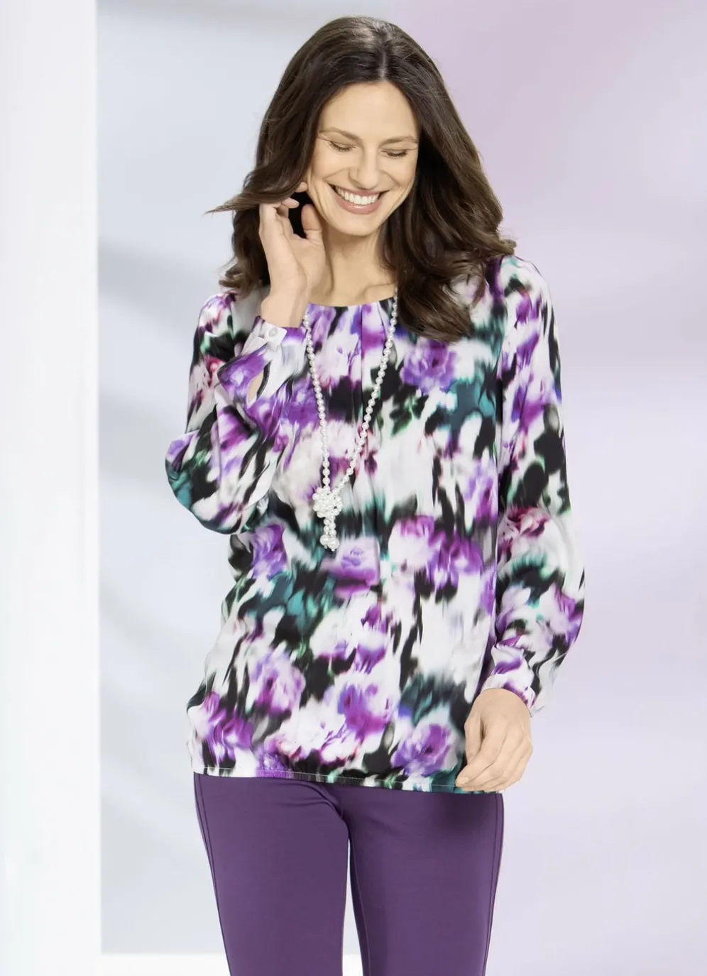 Mit farbbrillantem Druck in Weiß-Petrol-Flieder-Bunt zeigt sich diese hübsche Tunika: dekorative Fältelung am runden Halsausschnitt, lange Ärmel mit schmalen Manschetten sowie elastischer Saumabschluss.
