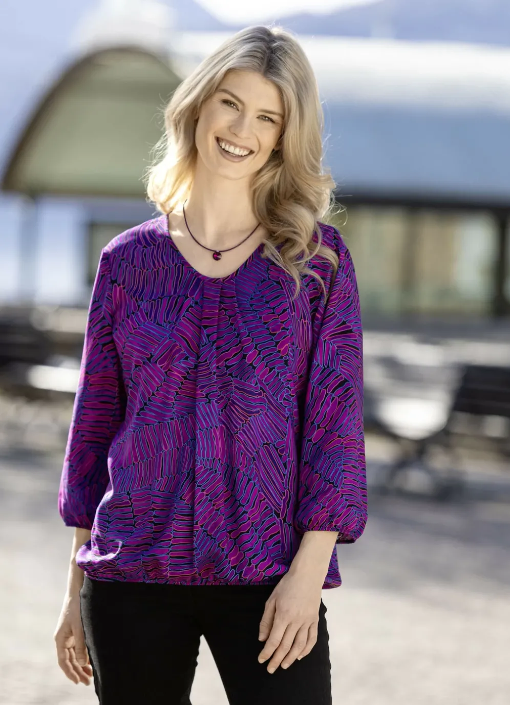 Flotte Tunika in Lila-Schwarz-Orange-Bunt, mit Fältelung am runden Halsausschnitt, 3/4-langen Ärmeln mit elastischen Abschlüssen sowie elastischem Saumabschluss rundum.