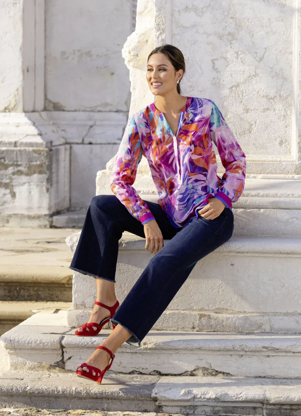 Farbenfrohe Tunika mit farbbrillantem Druck in Koralle-Fuchsia-Rosé-Bunt, hübscher Bändchenzier am V-Ausschnitt mit Stehkragen, kurzer, verdeckter Knopfleiste sowie schöner Bordüre an den langen Manschettenärmel und am Saumabschluss.