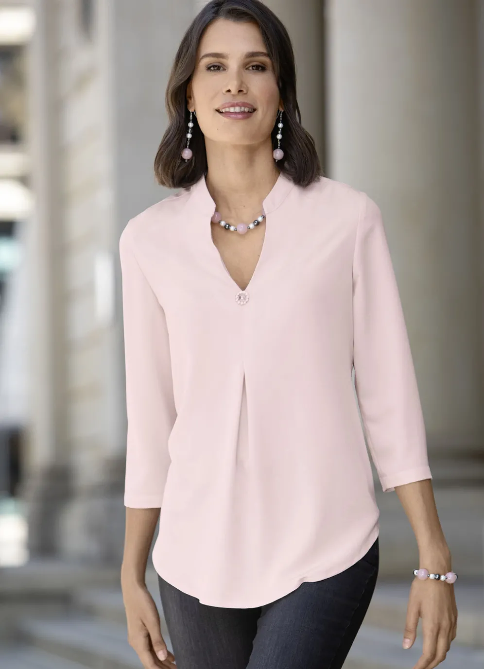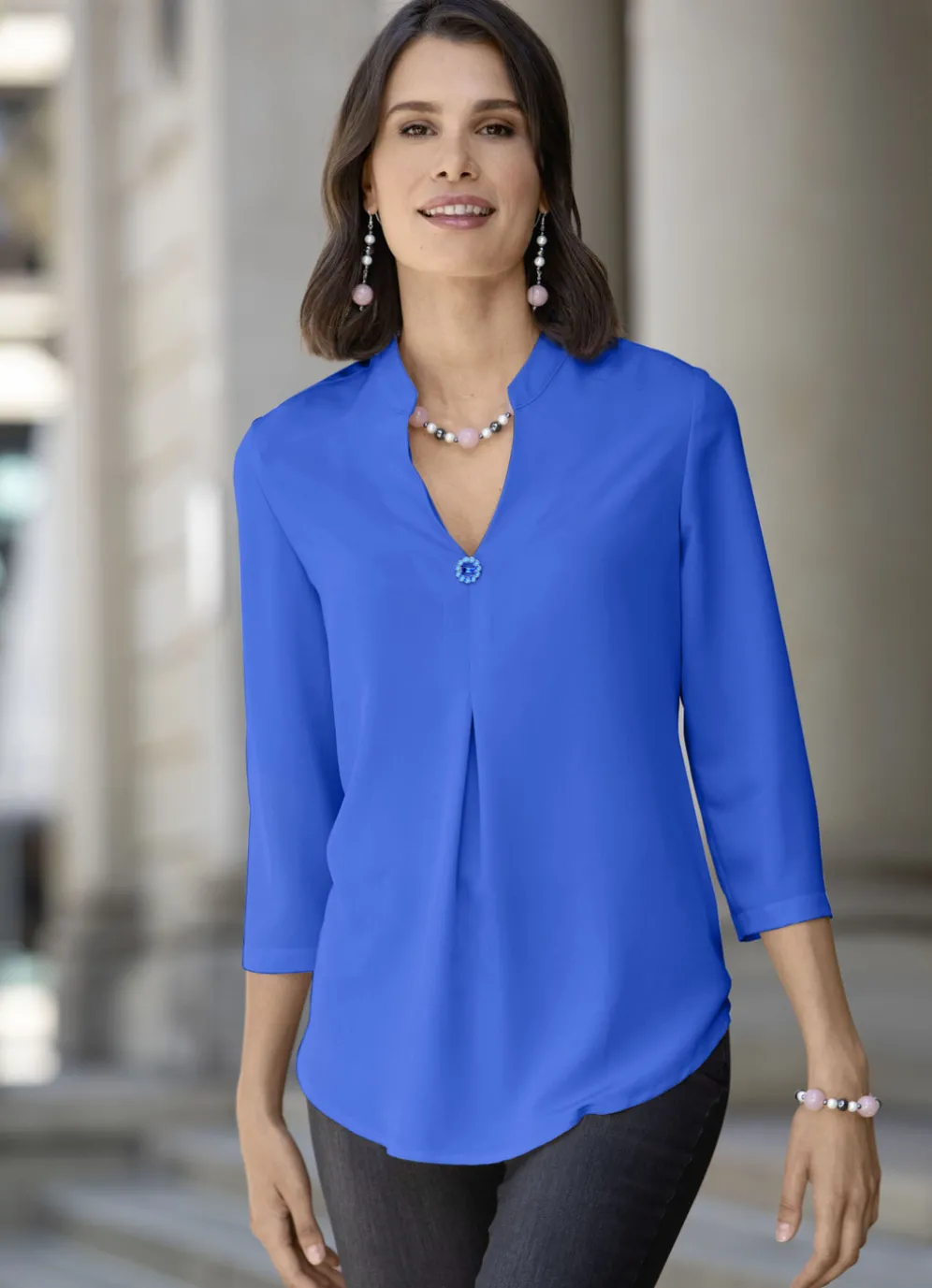Schöne Tunika mit Schmuckbrosche am V-Ausschnitt, 3/4-langen Ärmeln, Rückenpasse mit Kellerfalte sowie länger geschnittenem Rückteil.