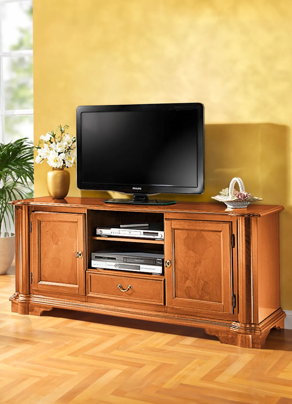 Prächtiges, teilmassives TV-Longboard mit echtem Wurzelholzfurnier an den eleganten, gerundeten Säulen sowie den Türfronten. Die Lieferung erfolgt aufgebaut
