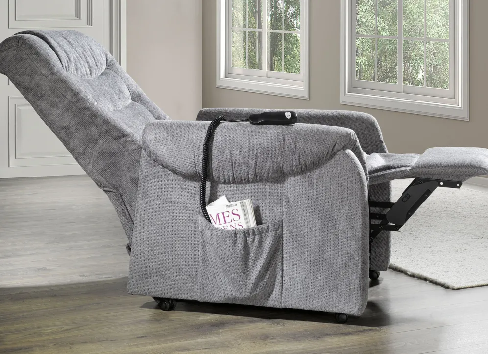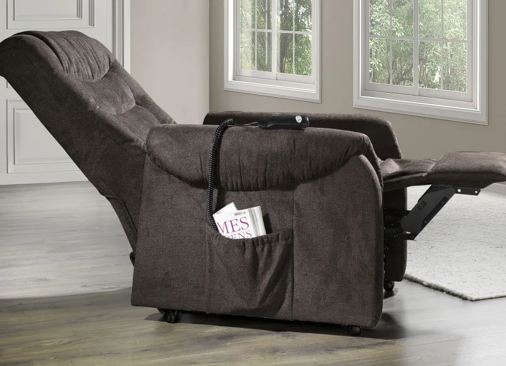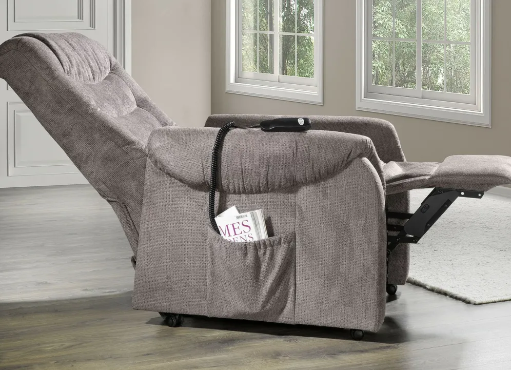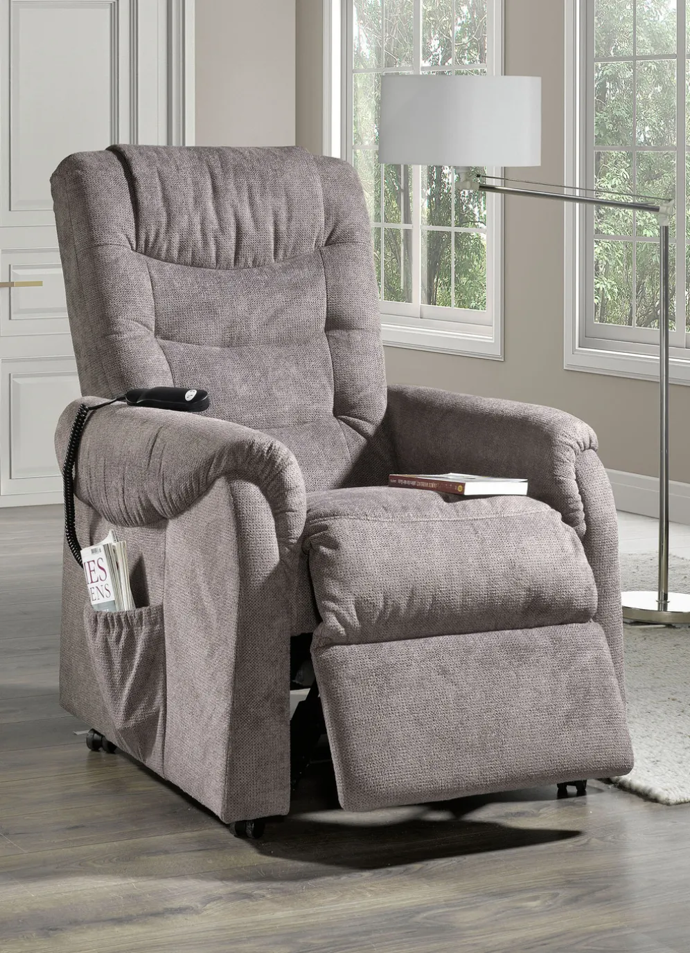 TV-Sessel mit Rollen und Federkern in der Ausführung manuell verstellbar und in Hellbraun.