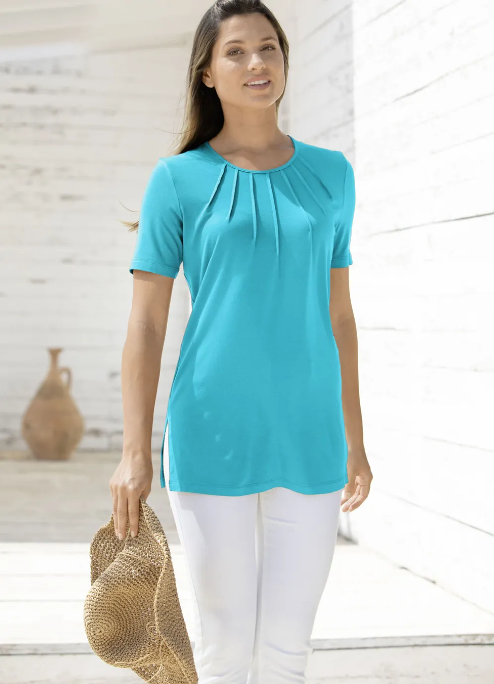 Kombistarke Shirt-Tunika mit rundem Halsausschnitt, kurzen Ärmeln, Biesenzier im Vorderteil mit aufspringenden Fältchen sowie Seitenschlitzen.