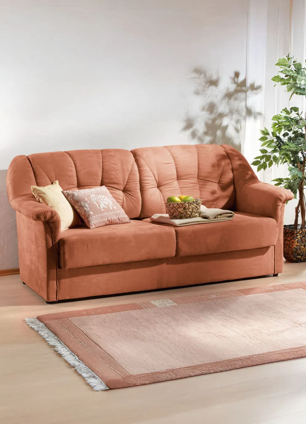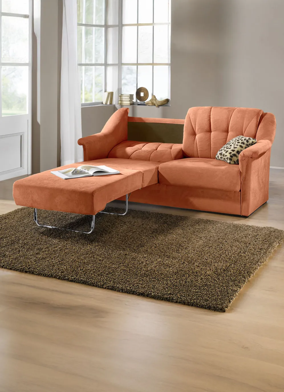 Attraktives Verwandlungssofa: beide Sitzflächen lassen sich separat je nach Wunsch, zum Einzel- oder Doppelbett umbauen. Weicher Alinesse-Microvelours-Bezug oder komfortabler Alcazar-Bezug, beide aus 100% Polyester. Auf stabilem Holzgrundgestell, mit hochwertiger Schaumstoff-Polsterung, Federkern und Vliesabdeckung.