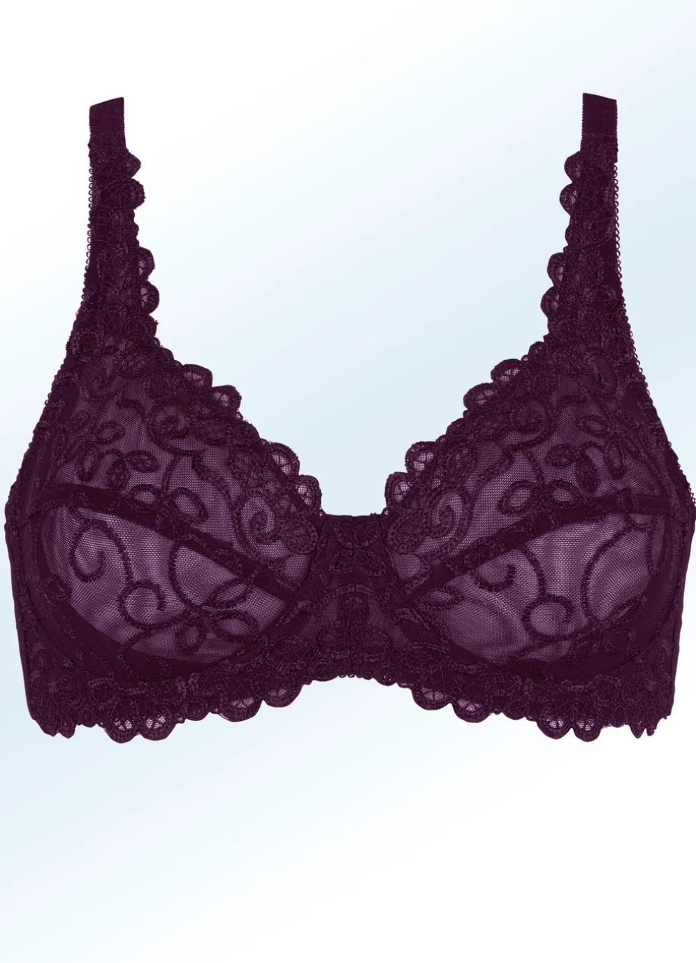 „Viania“-Bügel-BH mit Vorderteil ganz aus unterlegter Stickereispitze, Cupverstärkung und Stützstäbchen seitlich sowie verstellbaren Stretchträgern.