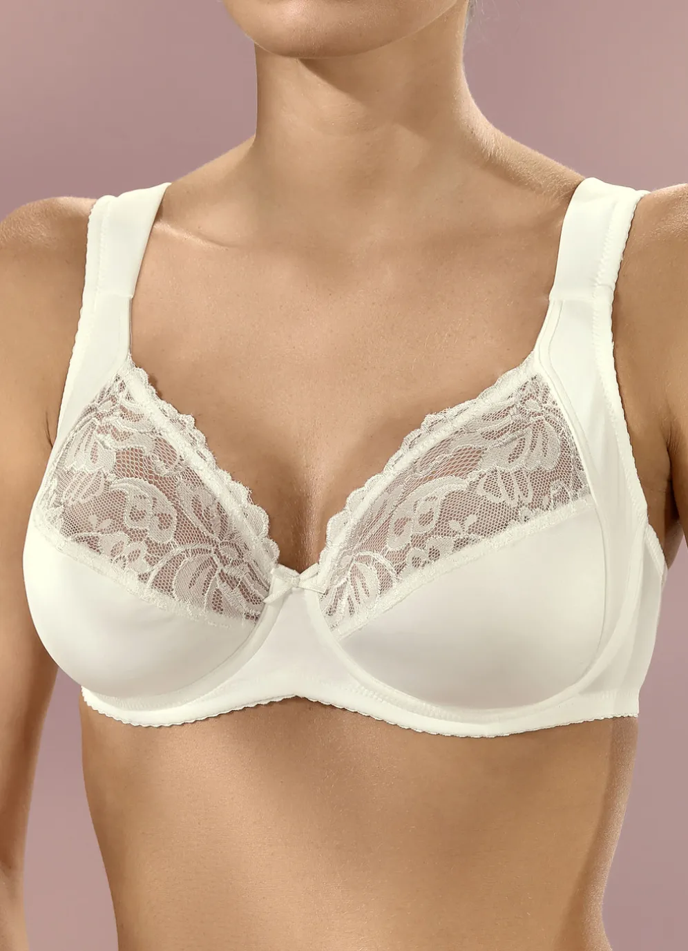 „Viania“-Bügel-BH mit Elastikspitze in den Obercups, unterlegten Untercups, seitlicher Cupverstärkung sowie im Schulterbereich weich gepolsterten, verstellbaren Stretchträgern.
