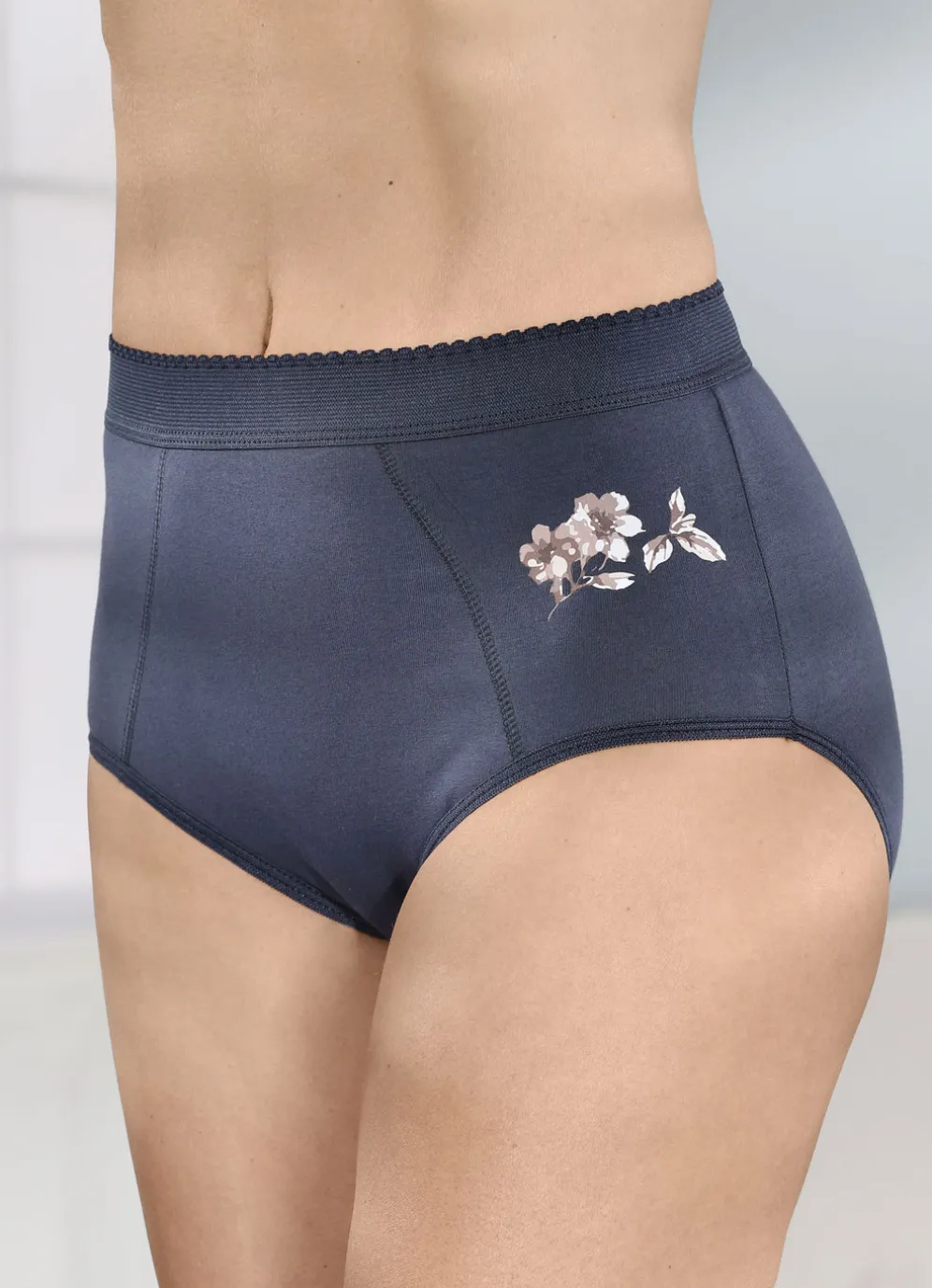 Formslip in Marine, mit hübschem Blumenmotiv im Vorderteil, verstärkter Bauchpartie sowie breitem Elastikbund.