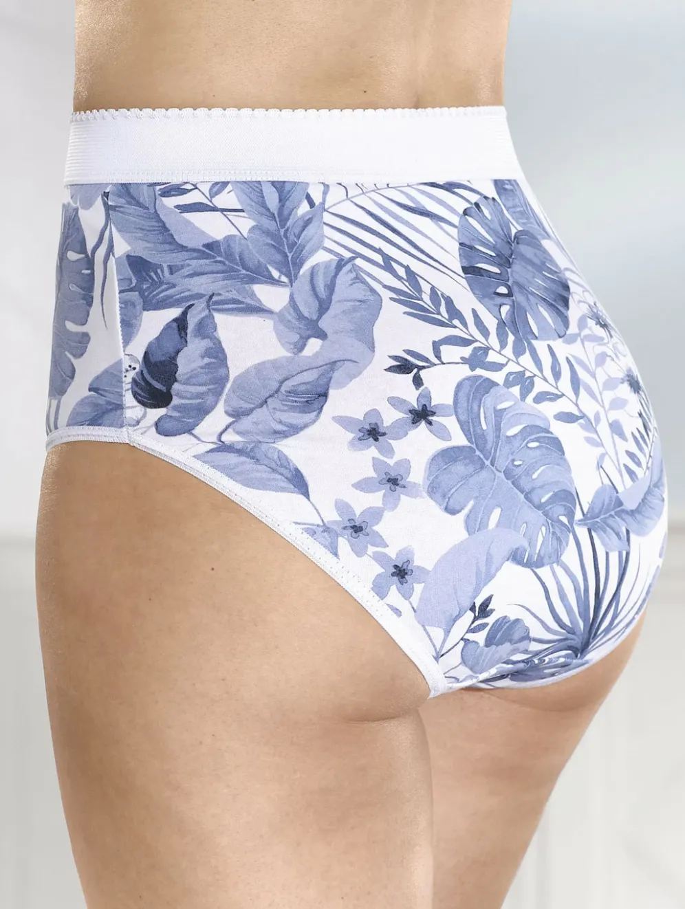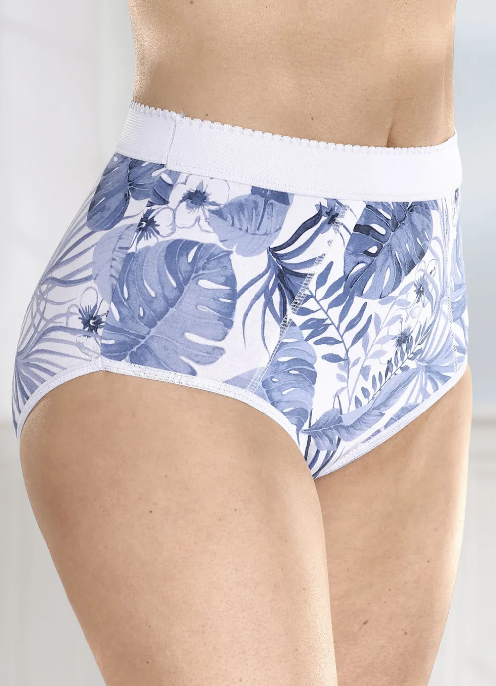 Weißgrundiger Formslip mit jeansblauem Floraldessin, verstärkter Bauchpartie sowie breitem Elastikbund.