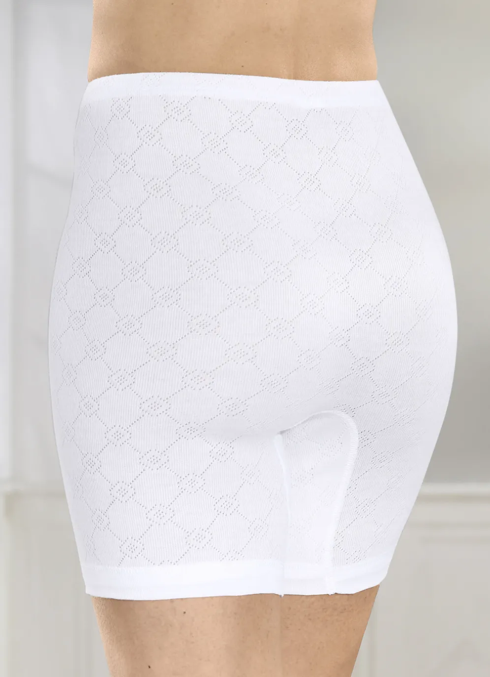 Langbein-Schlüpfer in Weiß, mit Jacquard-Dessin sowie Gummizug im Bund. Ohne Seitennähte.