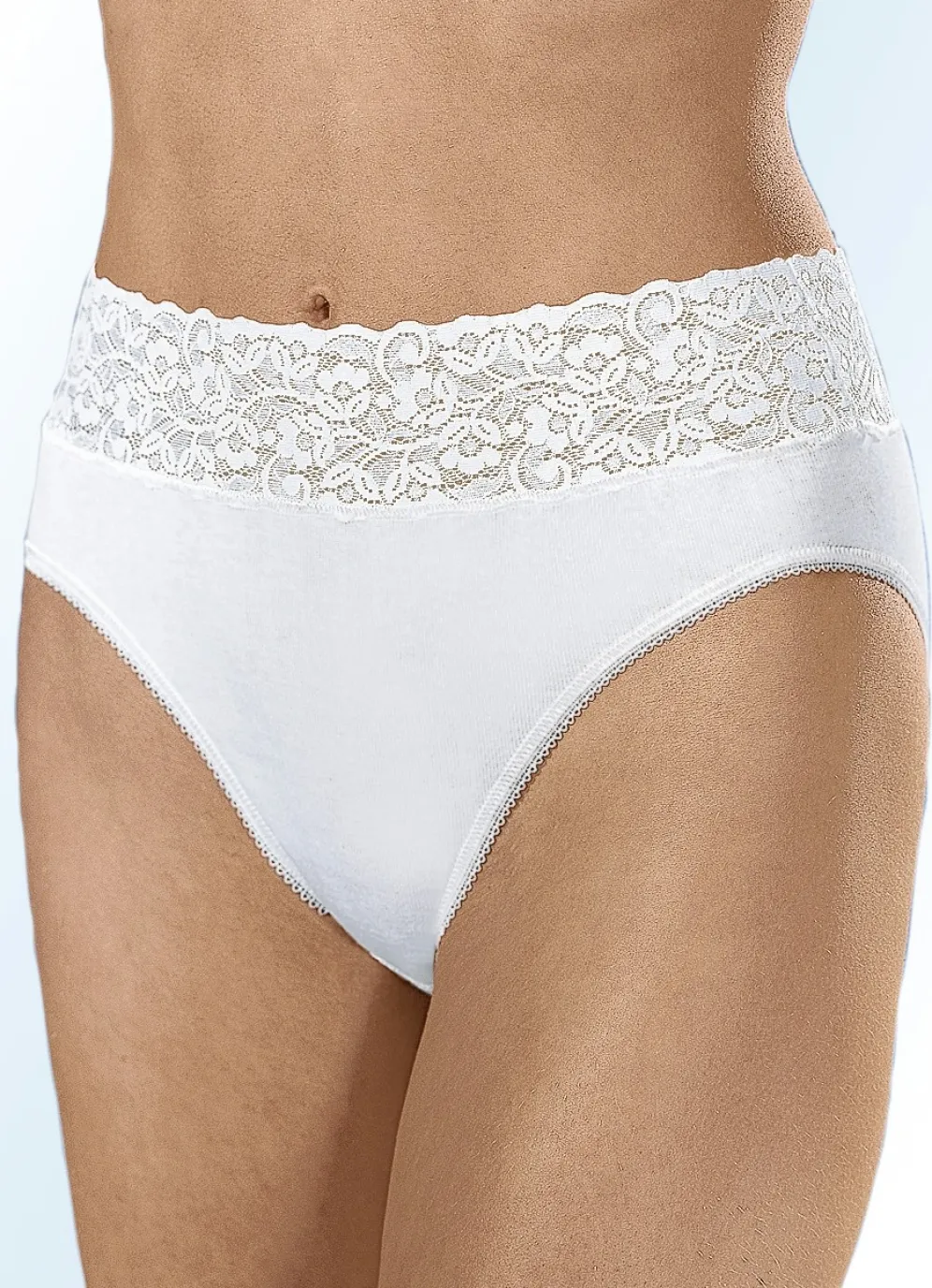 Viererpack Slips mit Elastikspitzenbund in Weiss und in Größe 40.