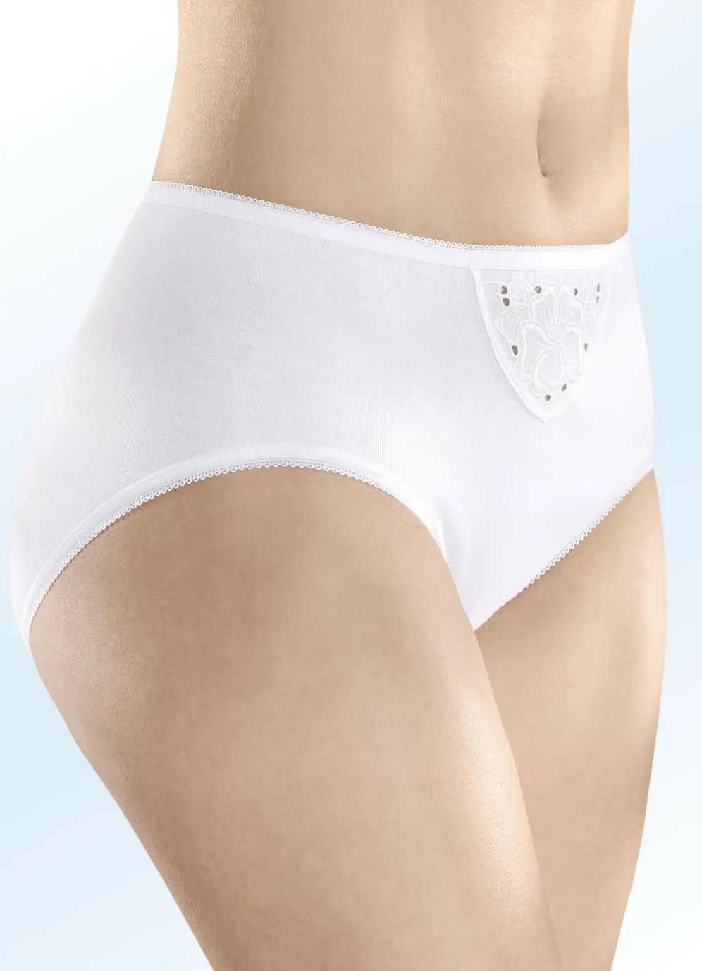 Weißer „Speidel“-Slip mit Batistmotiv im Vorderteil und elastischen Abschlüssen. Ohne Seitennähte.