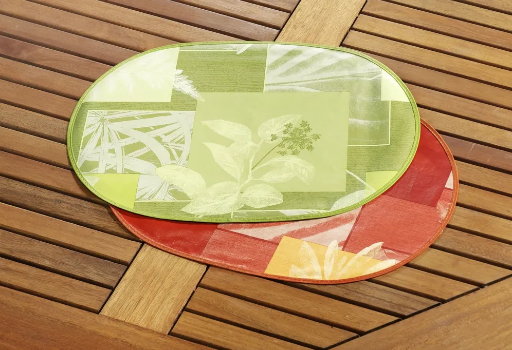 Wachstuch-Serie mit farblich abgestimmtem Schrägband in Größe 302 (2 Platzsets, 34/ 47 cm) und in Terra.