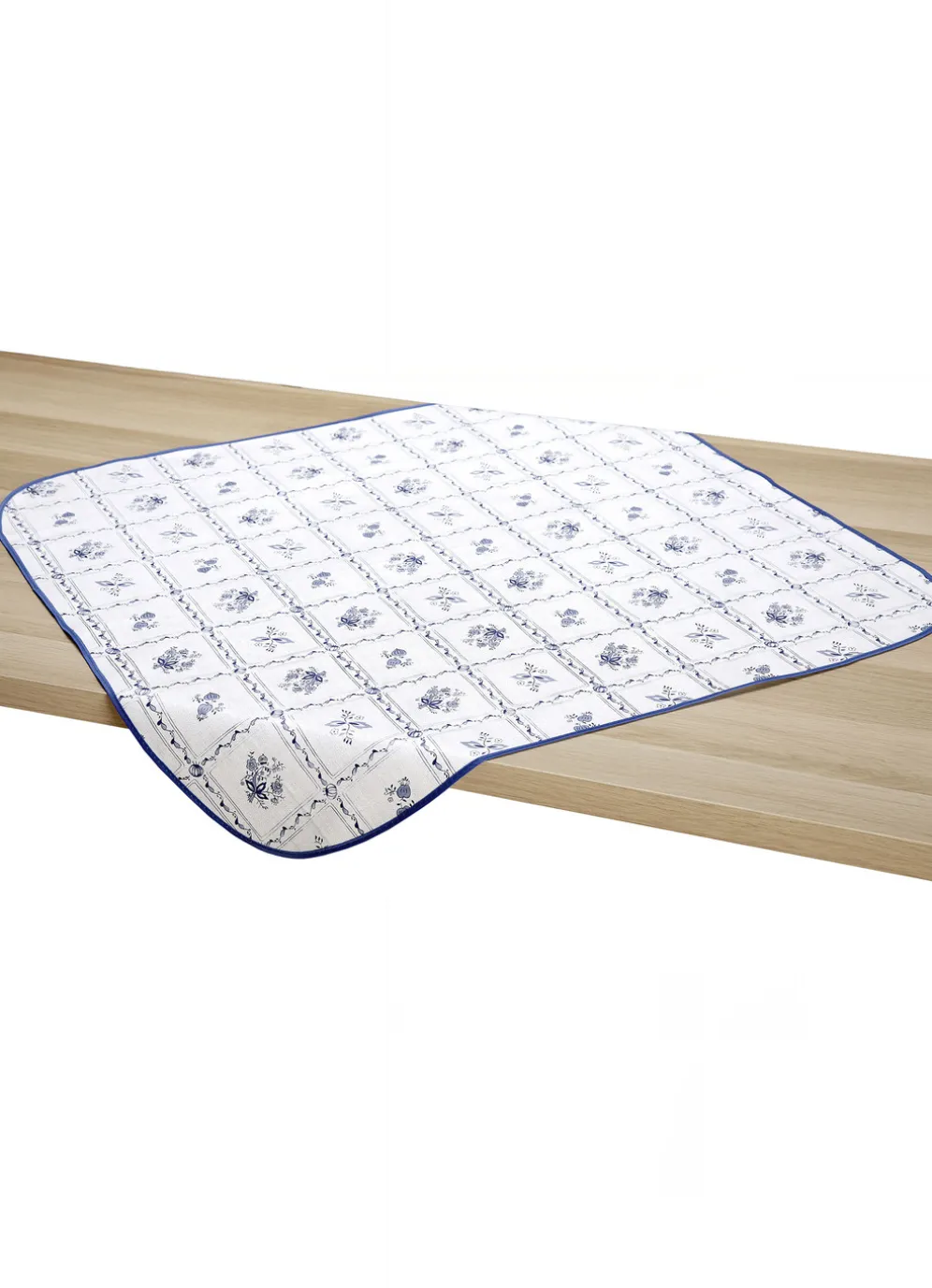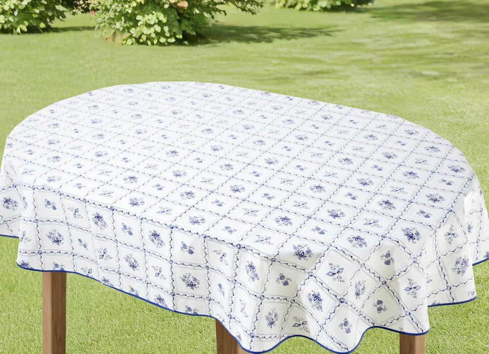 Ideal für den Essplatz geeignet ist diese attraktive, blau-weiße Wachstuch-Tischdecke, die sich herrlich problemlos feucht abwischen lässt und mit geschmackvoll farblich abgestimmtem Schrägband gearbeitet ist.