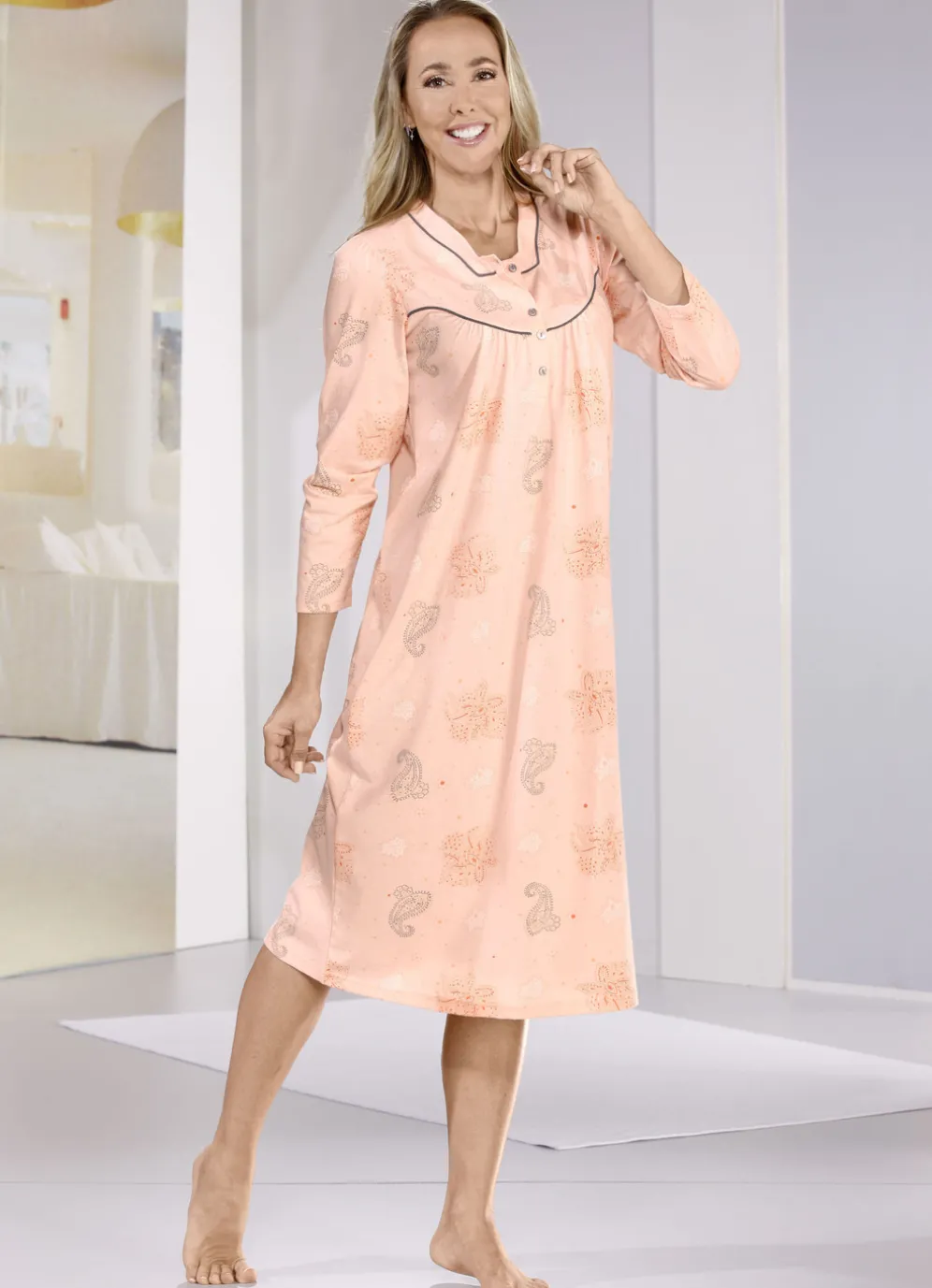 Wadenlanges Nachthemd in Apricot-Taupe-Bunt: Halsausschnittblende und Vorderpasse mit Kontrastpaspel, lange Knopfleiste, Raffungen vorne sowie am Ansatz der langen Ärmel.
