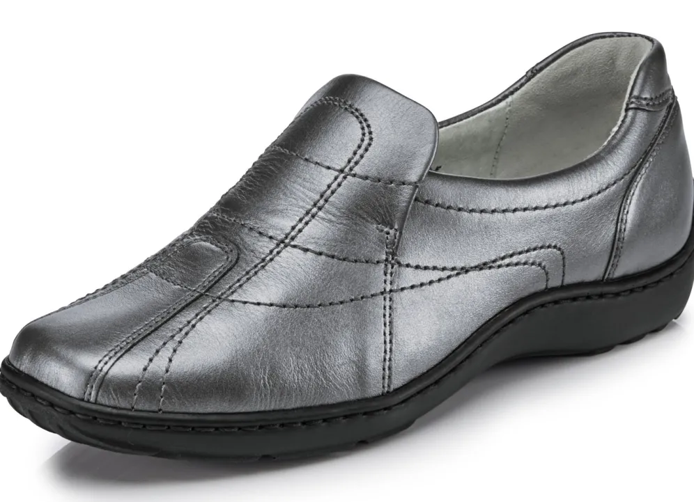 Slipper aus Rindleder mit edlem Metallic-Schimmer: in Weite H, verdeckter Gummizug, ledergefüttertes Quartier, herausnehmbares Leder-Massagefußbett, leichte PU-Handnaht-Profilsohle sowie 20 mm Keilabsatz