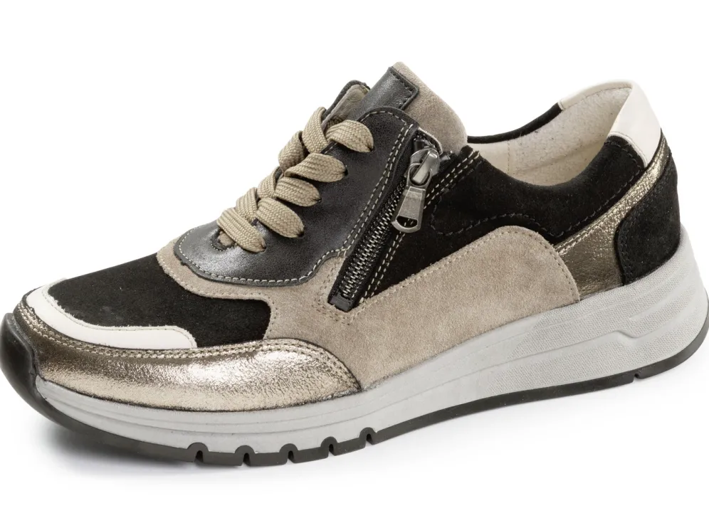 Sneaker aus Leder in interessantem Material-Mix, teilweise mit Textil-Einsatz und schimmernden Akzenten: Weite H, Schnürung, Seitenreißverschluss, ledergefüttertes Quartier, herausnehmbares Lederfußbett, leichte Microlight-Luftpolstersohle, 20 mm Keilabsatz