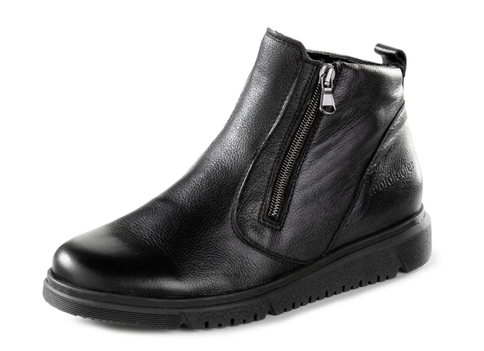 Schwarze Stiefeletten aus weichem, genarbtem Nappaleder, mit zwei seitlichen Reißverschlüssen: in Weite H, wärmendes Textilfutter, herausnehmbares Fußbett, leichte Rubflex-Profilsohle sowie 20 mm Keilabsatz. Schafthöhe ca. 11 cm